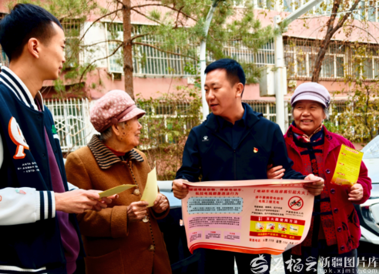 11月4日,在乌鲁木齐市沙依巴克区扬子江路街道扬子江社区市政小区,社区普法志愿者为居民宣传防火的重要性。白雪晴摄