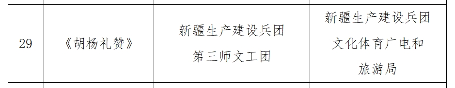 此外,由新疆生产建设兵团文化体育广电和旅游局推荐、新疆生产建设兵团第三师文工团创演的《胡杨礼赞》是兵团唯一入围参演作品。