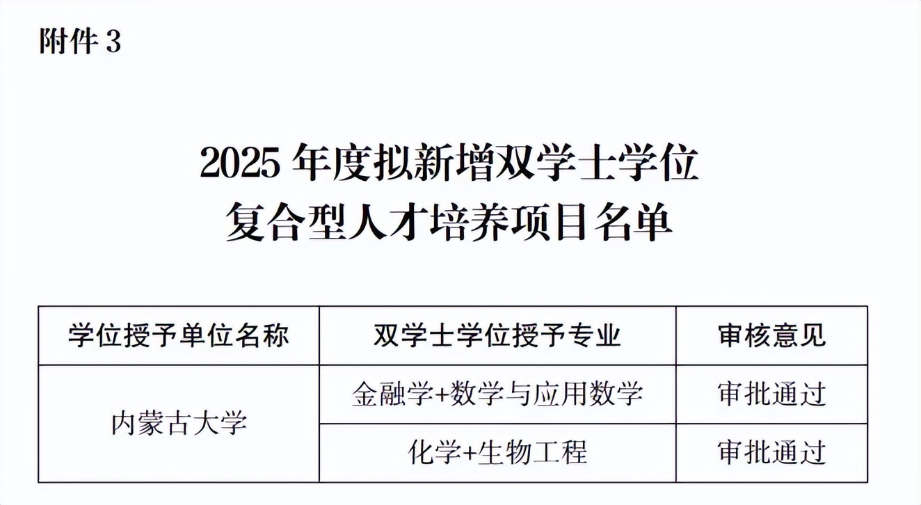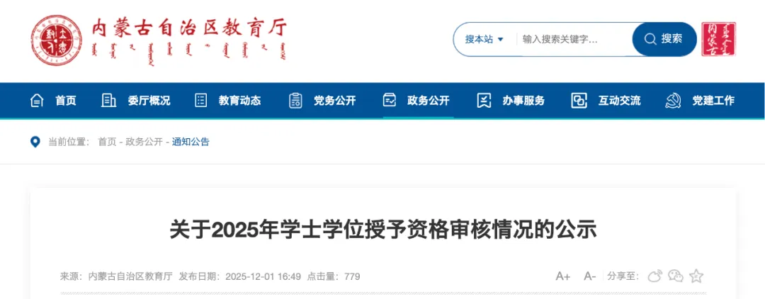 A+ A. A-近日,内蒙古自治区教育厅发布《关于2025年学士学位授予资格审核情况的公示》。