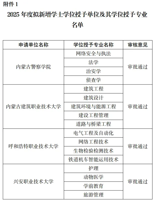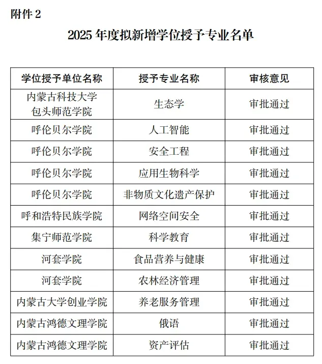 根据《内蒙古自治区学士学位授权与授予管理办法(修订)》(内学位〔2022〕2号)有关规定,自治区人民政府学位委员会办公室组织开展了2025年度学士学位授权专业审核工作。经单位自评、形式审查、专家组评审等环节,现将拟增列学士学位授权专业名单予以公示。同步公示2025年度拟新增双学士学位复合型人才培养项目名单。公示时间为2025年12月1日—12月14日。