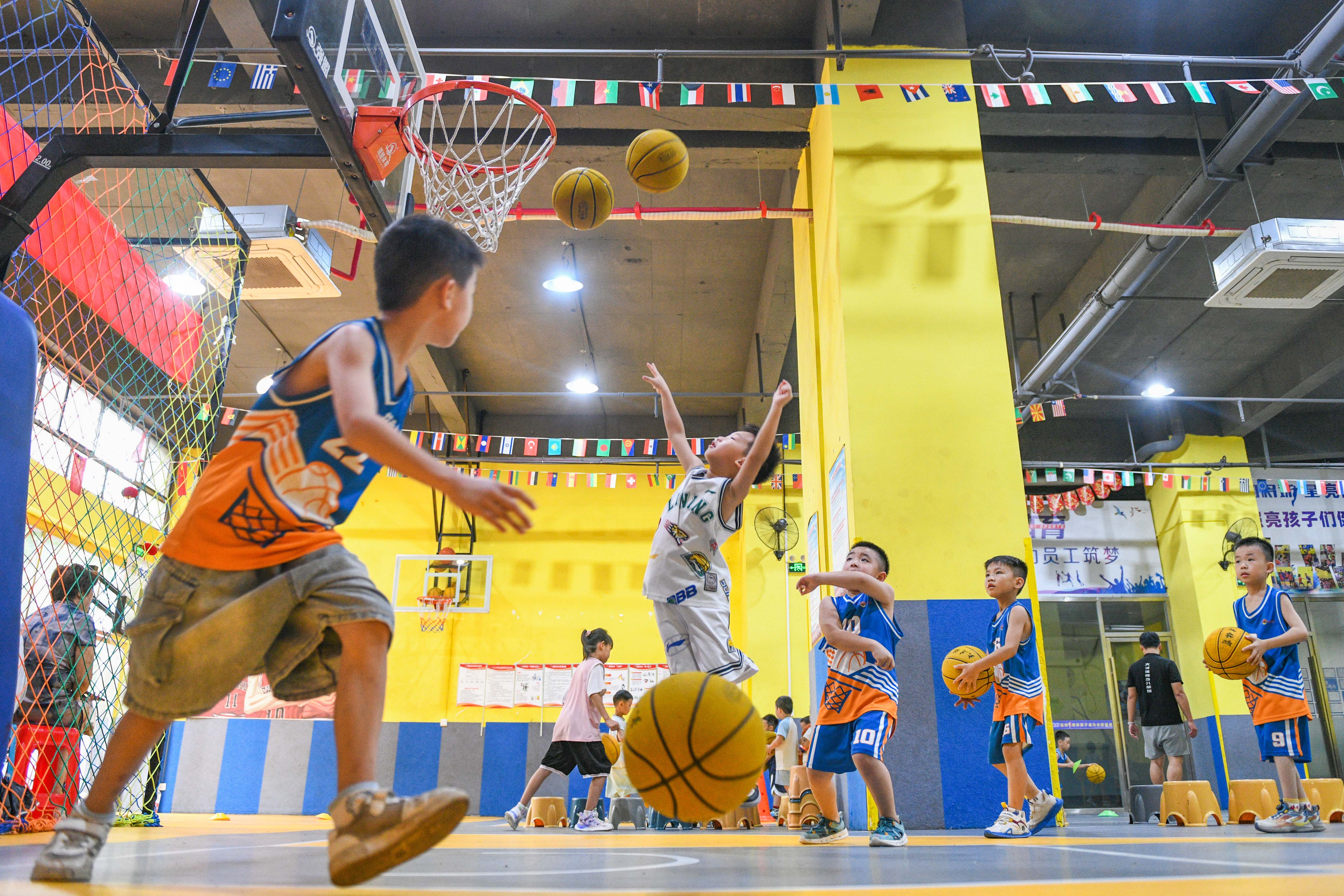 7月12日,在一所体育培训机构里,孩子们在参加篮球训练。新华社发(蒋克青 摄)