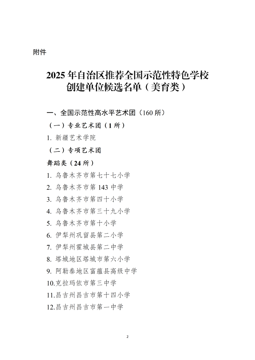A+ A. A-根据《教育部办公厅关于开展全国示范性特色学校创建的通知》(教体艺函〔2025〕37号)精神,经学校自评申报、各地(州、市)教育局审核推荐、自治区教育厅组织专家评审,拟推荐160所学校为全国示范性高水平艺术团候选单位、5所高校为中华优秀传统文化艺术传承基地候选单位(排名不分先后)。现予以公示,公示期为2025年12月4日至8日。