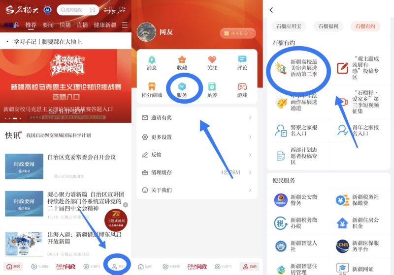 2、打开石榴云——点击“我的”——进入“服务”——在“石榴云有约”里找到“新疆高校最美宿舍展选活动第二季”;