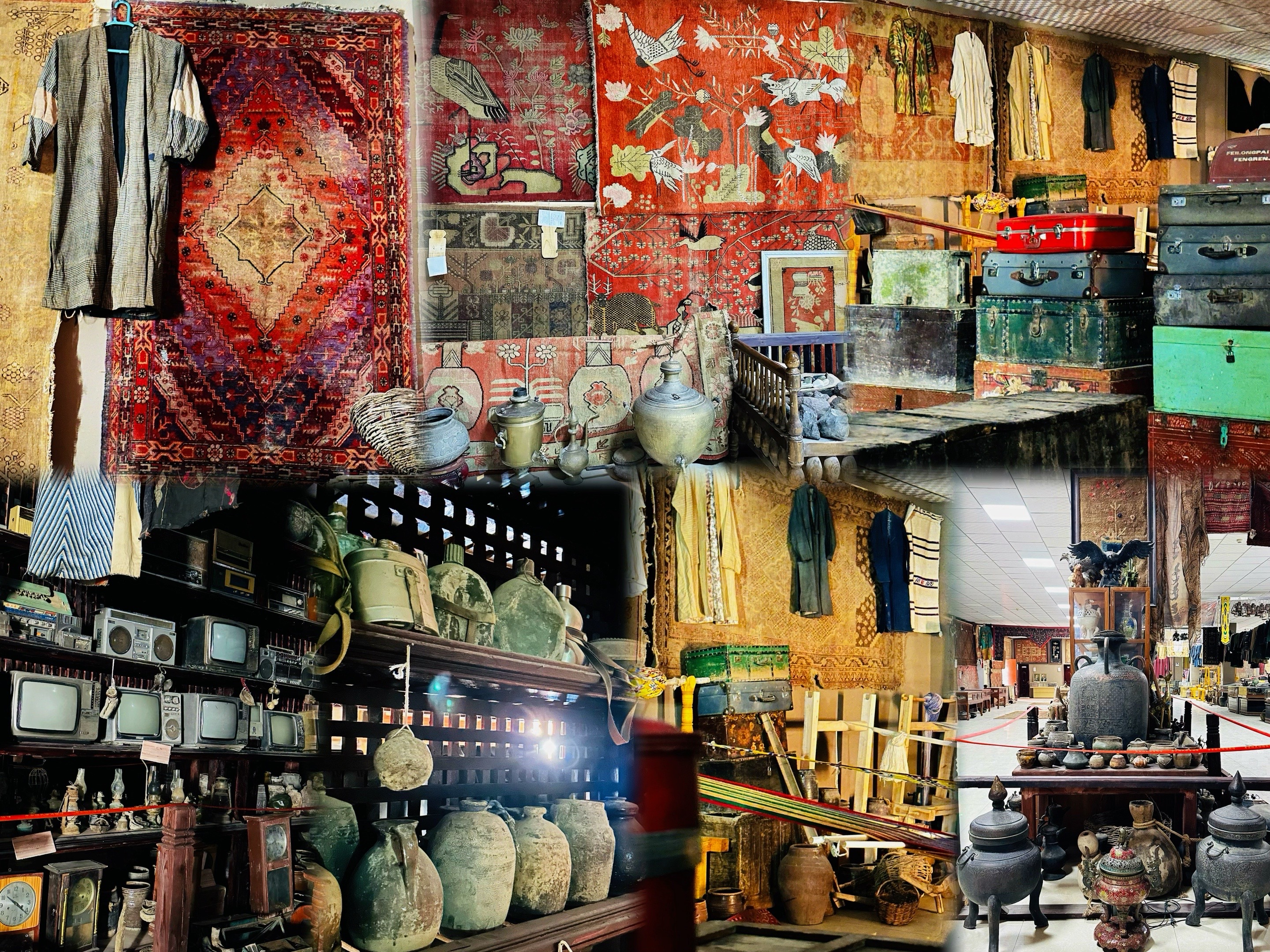 推开这扇承载时光的木门,一座民俗宝库展现在眼前。展柜上,铜壶、陶罐、煤油灯、算盘、粮票、黑白电视机等生活用品层叠摆放,诉说着往昔的烟火气息;地上,一台台不同年代的艾德莱斯纺织机静静陈列,仿佛能听见织布机哒哒的声响;各色花帽与老式地毯色彩斑斓,让人仿佛置身于吐鲁番深厚的民俗文化长河之中。馆内8000余件老物件,是凯丽比努尔与父亲走遍各地精心淘来的珍宝,每一件都承载着一段尘封的记忆。