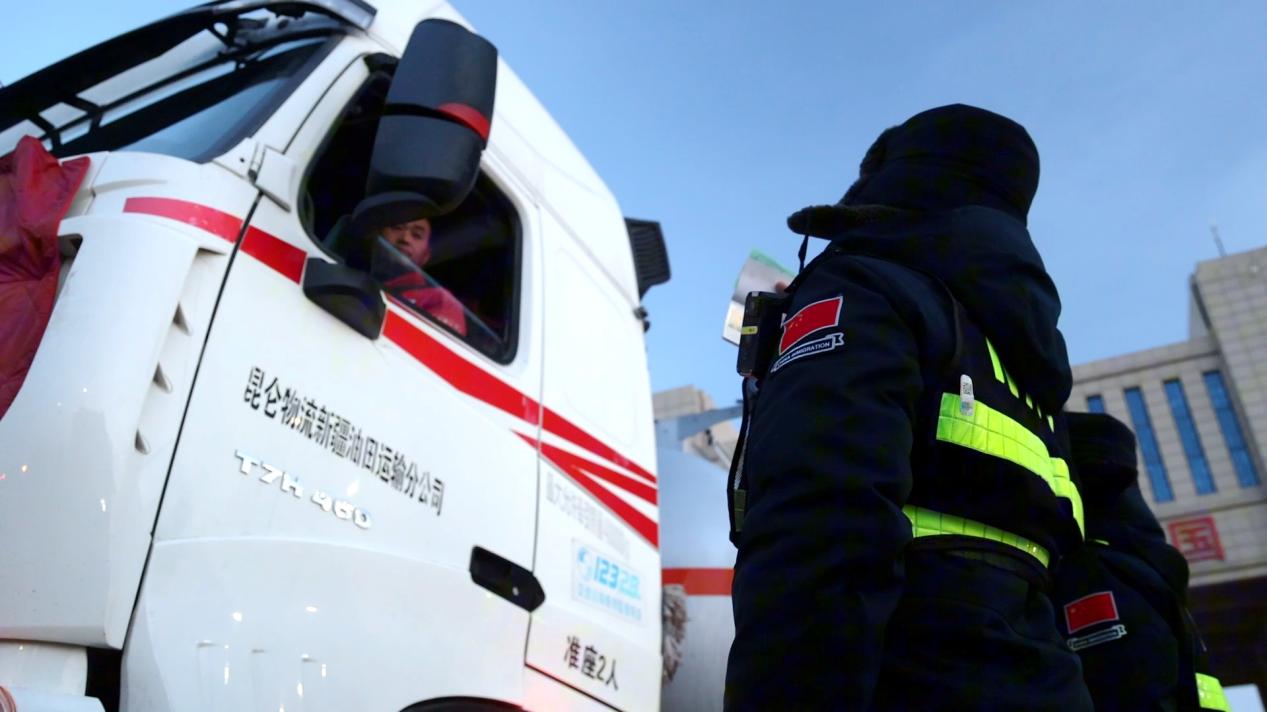 阿拉山口边检站民警对货车司机进行人证核对。徐超 摄