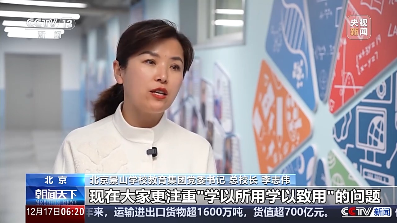 北京景山学校教育集团党委书记 总校长 李志伟:过去可能学生只是学了而已,但是学完了以后到底怎么用,用到什么程度,应该说我们过去忽略了这样一个环节,现在大家更注重“学以所用学以致用”的问题。