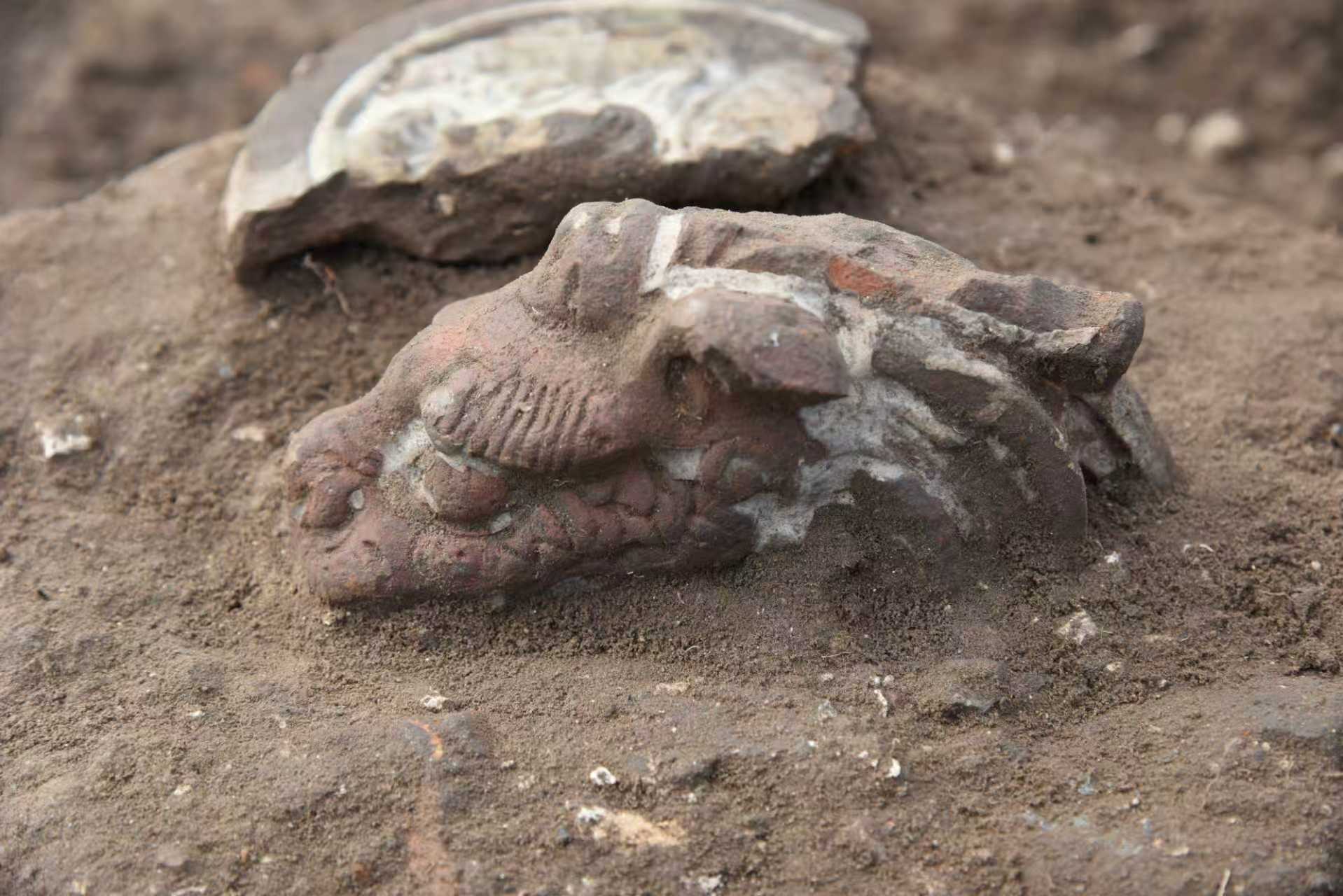 据了解,本年度发掘出土遗物主要出自基址上的倒塌堆积,出土遗物多为建筑材料,包括陶板瓦、筒瓦、瓦当、滴水、脊兽、砖,以及石螭首、栏杆构件等。陶建筑材料多有琉璃器,以绿色琉璃为多。瓦当、滴水纹饰以龙纹为主,凤纹为次。其他遗物中可见大量残塑件,应是建筑或佛像上的装饰品。