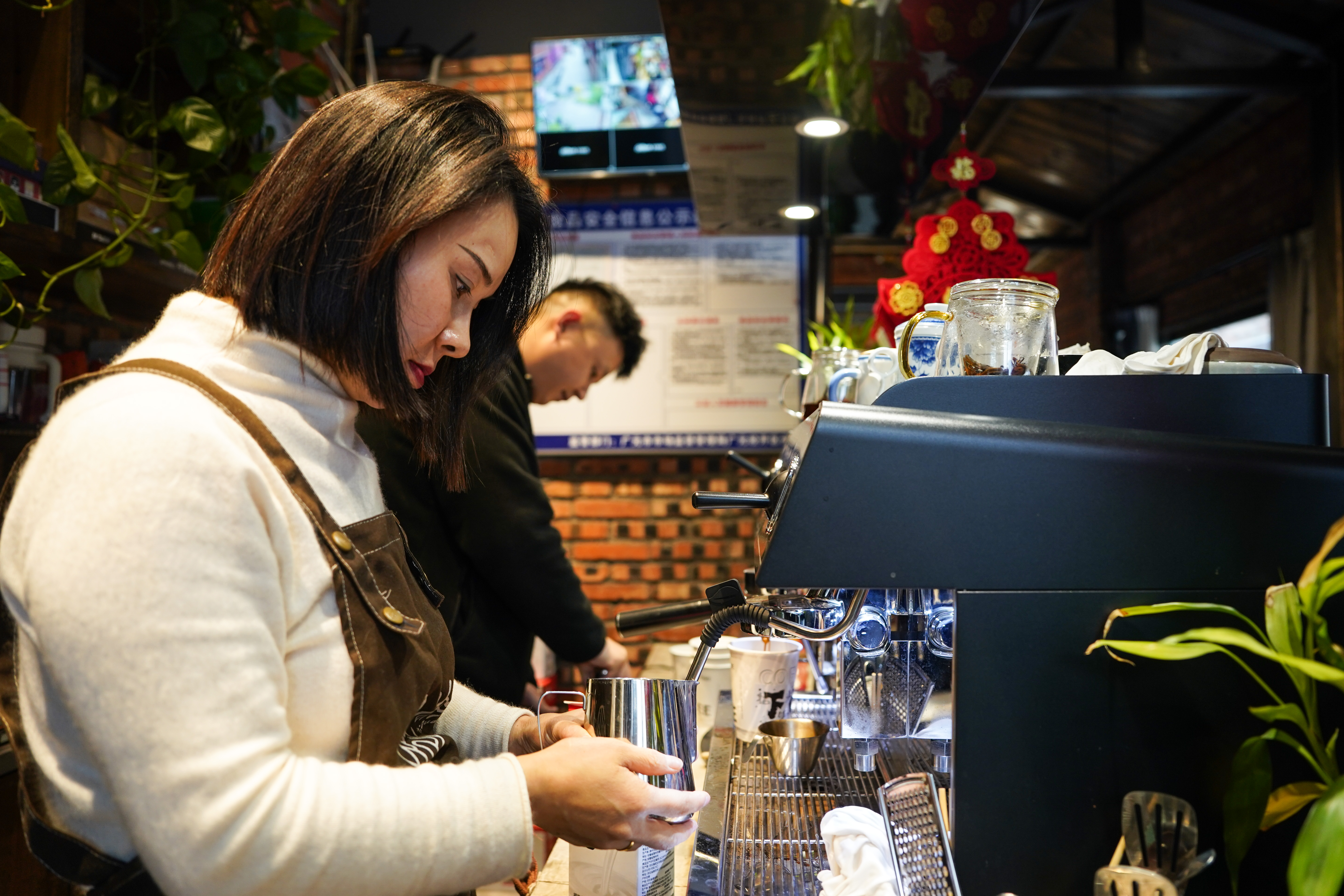 ⬆️12月12日,咖啡师在“南站记忆”主题街区拾光咖啡馆内制作咖啡。