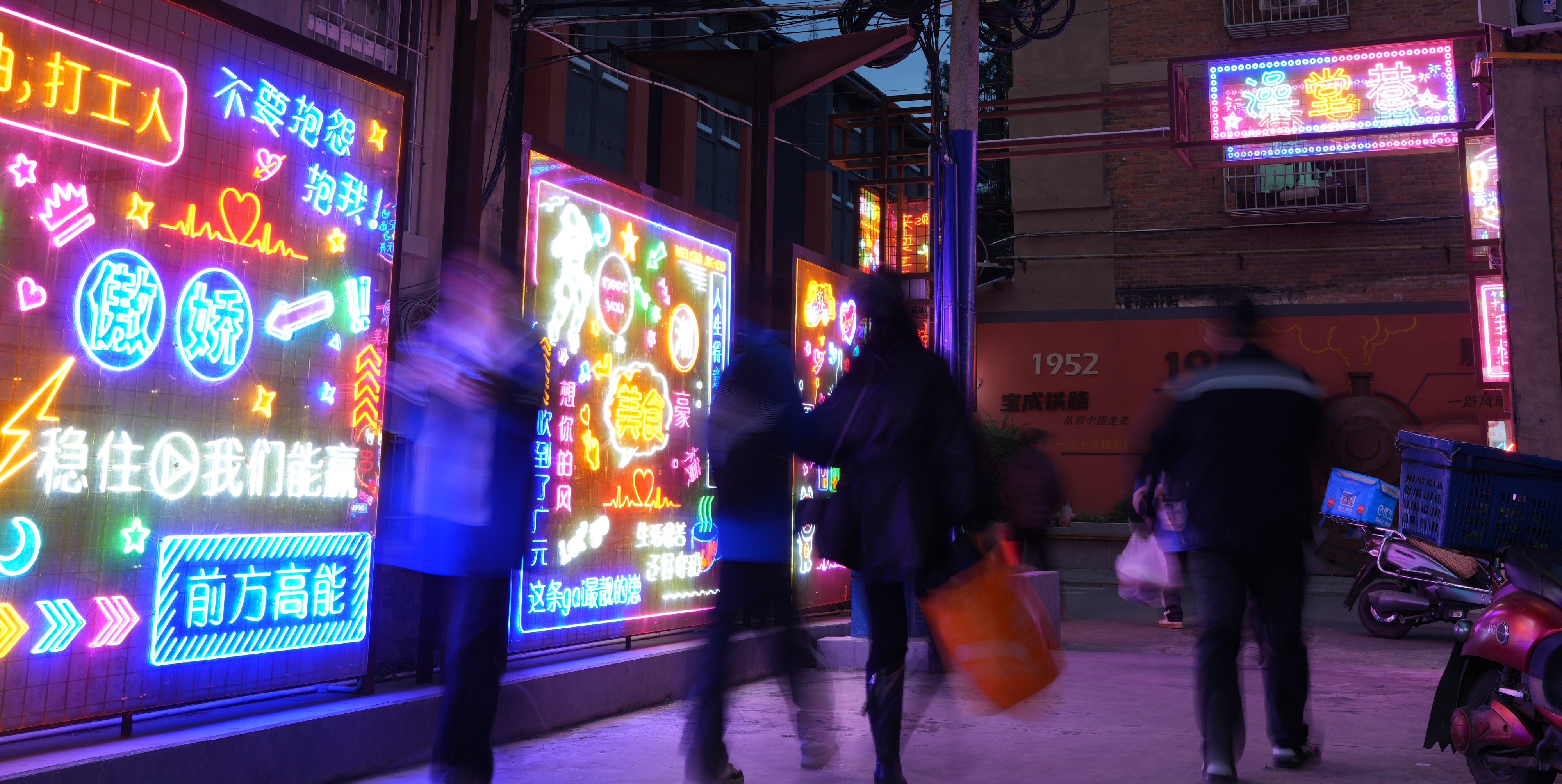 ⬆️12月12日,人们走过“南站记忆”主题街区的霓虹灯牌。
