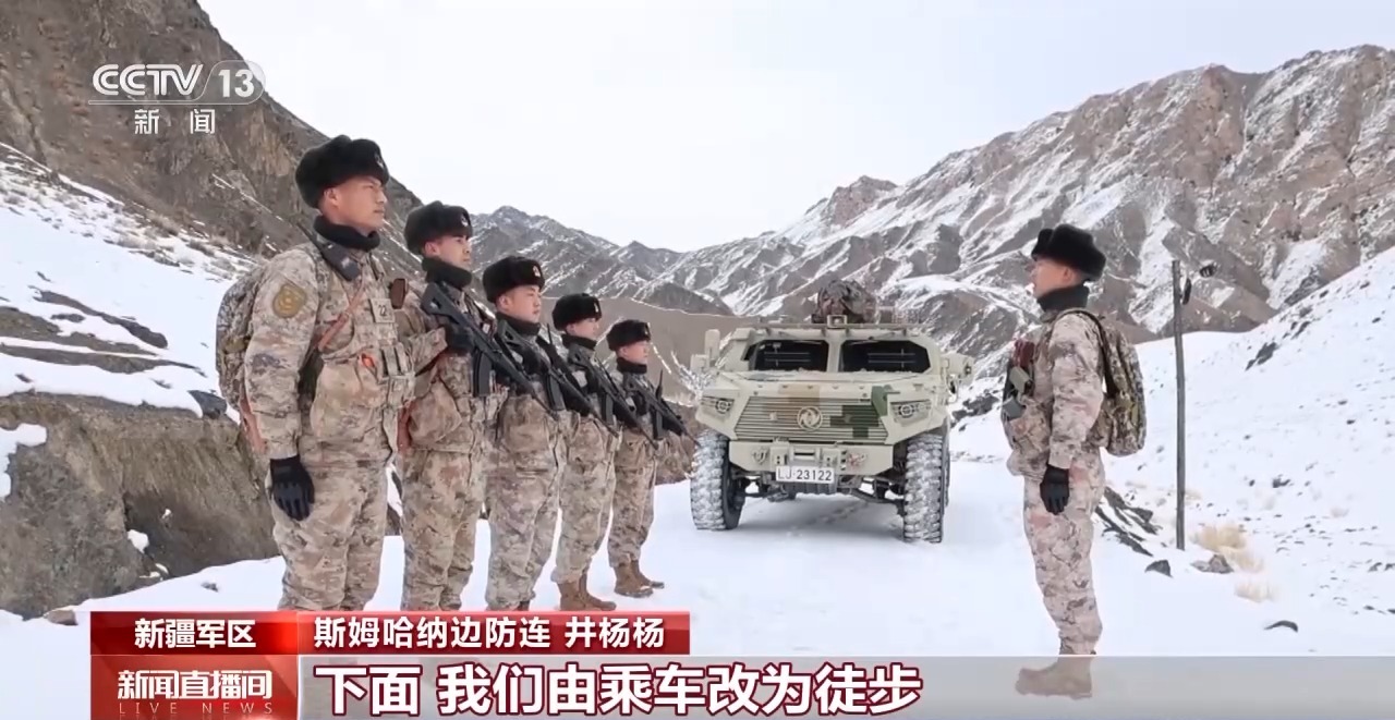 斯姆哈纳边防连 井杨杨:前方道路积雪较厚,下面,我们由乘车改为徒步,距前方点位还有2.5公里,下面我们对武器装备进行检查。