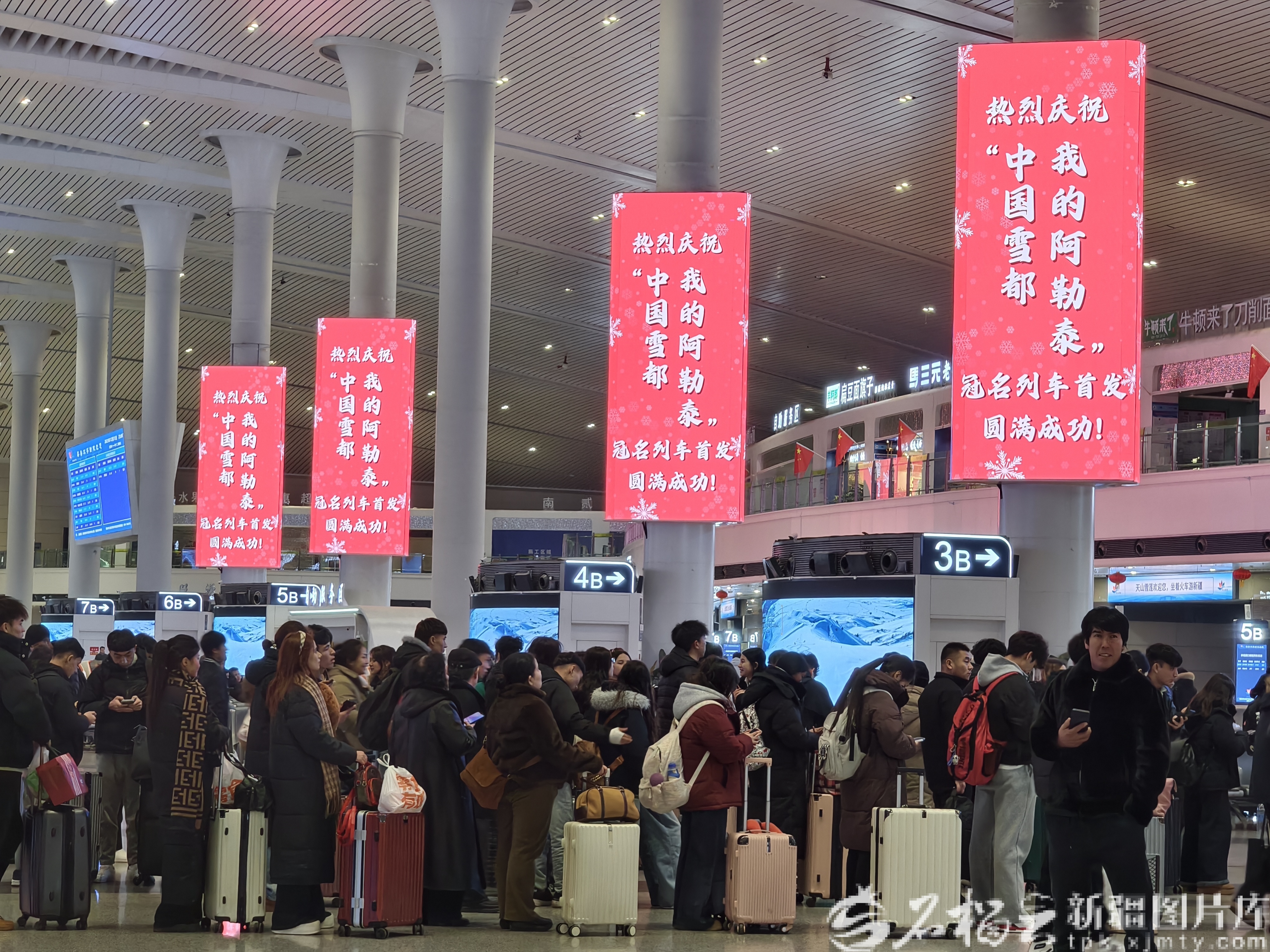 2025年12月31日,新疆铁路部门以冰雪为主题全新打造的首趟“中国雪都·我的阿勒泰”号旅客列车从乌鲁木齐站鸣笛启程,300余名旅客乘坐火车前往阿勒泰。