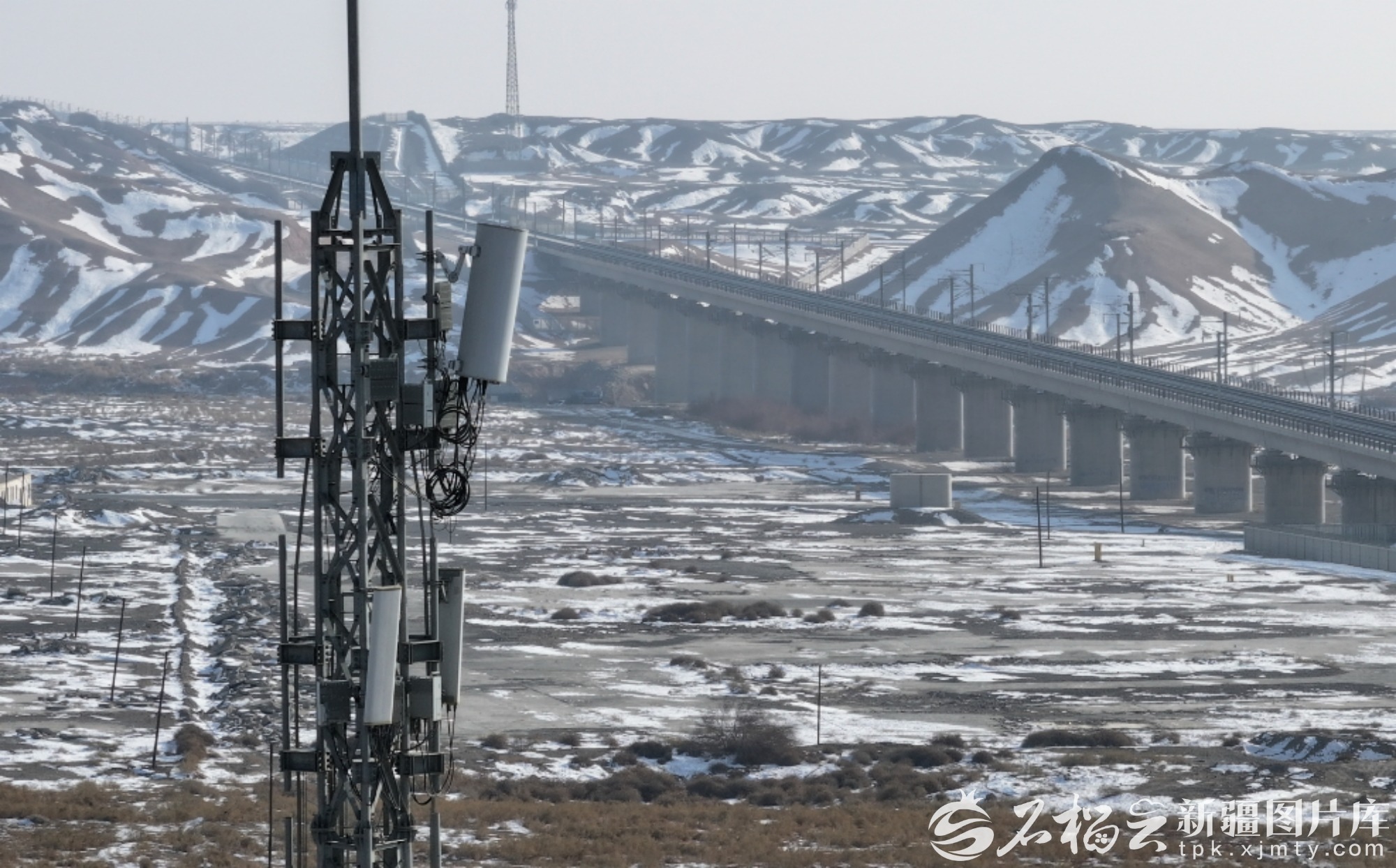 1月2日,兰新高铁哈密至鄯善北段矗立的5G信号塔。郭子毅摄