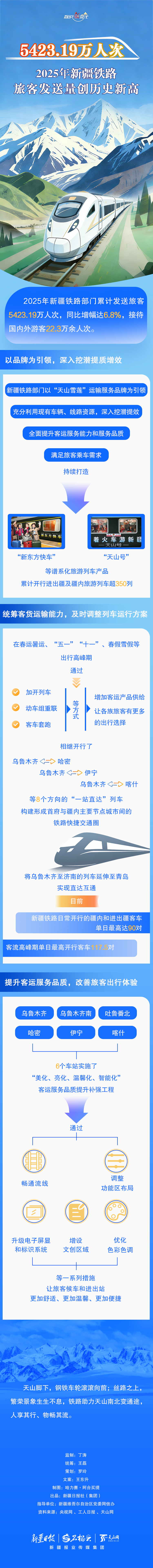 A+ A. A-2025年,新疆铁路部门累计发送旅客5423.19万人次,同比增长6.8%。这张亮眼的“成绩单”背后,新疆铁路部门采取了哪些举措?旅客运输实现稳步增长的关键支撑又是什么?本期《数说“新”变化》,我们一同解读。