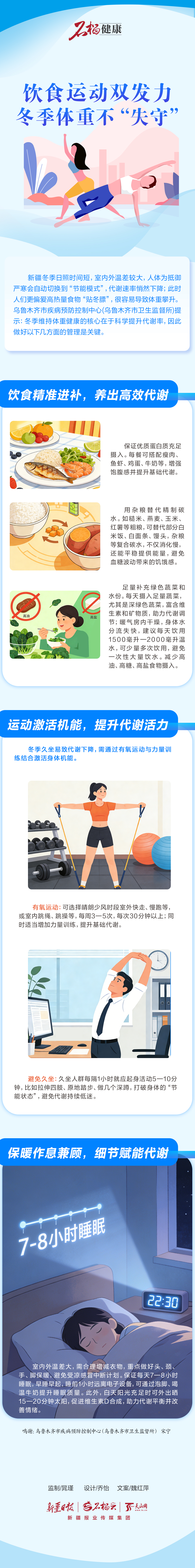 新疆冬季日照时间短,室内外温差较大,人体为抵御严寒会自动切换到“节能模式”,代谢速率悄然下降;此时人们更偏爱高热量食物“贴冬膘”,很容易导致体重攀升。乌鲁木齐市疾病预防控制中心(乌鲁木齐市卫生监督所)提示:冬季维持体重健康的核心在于科学提升代谢率,因此做好几方面的管理是关键。