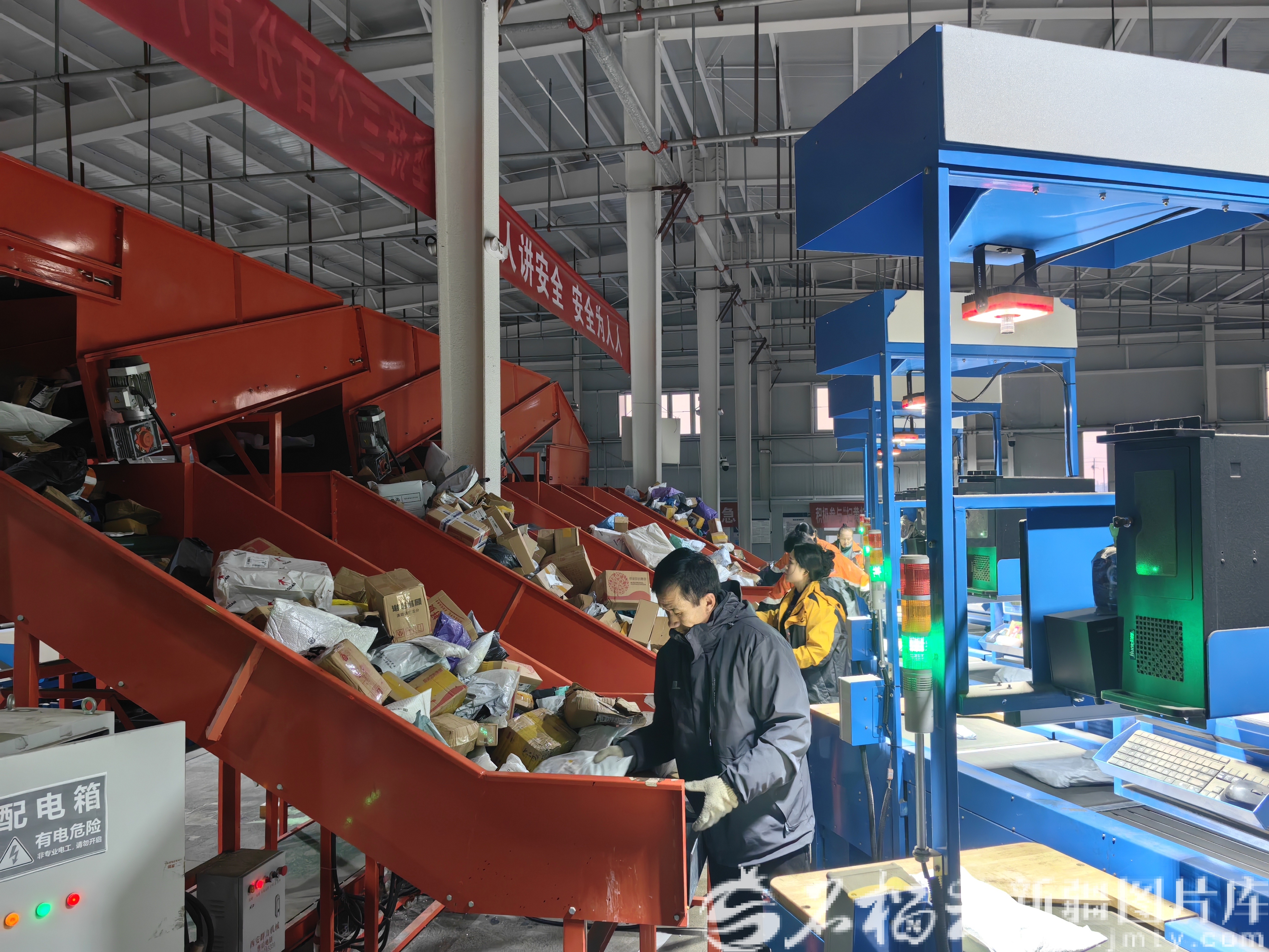 2025年11月11日,在昌吉市三工镇的一处快递分拣中心,工作人员正忙着分拣快递。付小芳摄