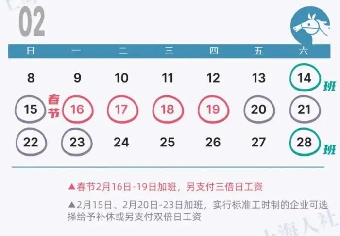 法定节假日为2月16日(除夕)至19日(初三),根据劳动法和《工资支付暂行规定》,用人单位安排劳动者在这些天加班的,应按照不低于劳动合同规定的劳动者本人日或小时工资标准的300%支付劳动者工资,且不能以补休替代。