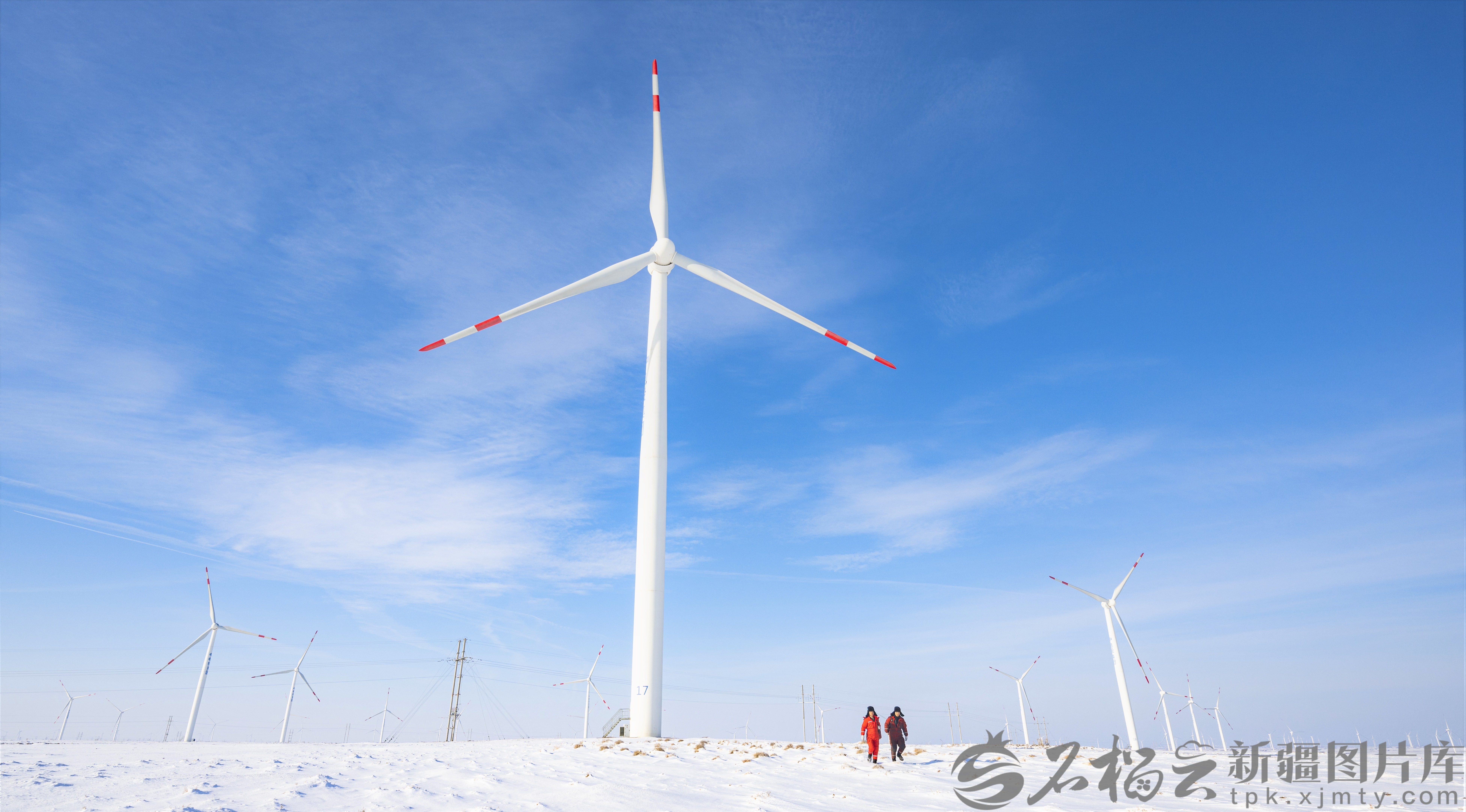 1月13日,木垒老君庙风电场,国家电投集团新疆能源化工木垒新能源有限公司检修人员在巡检风机。何龙摄