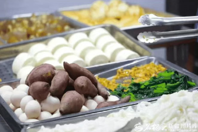 新疆工程学院推出的“励志一元餐”包括鸡蛋、红薯、小菜、玉米粥等。来源:新疆工程学院
