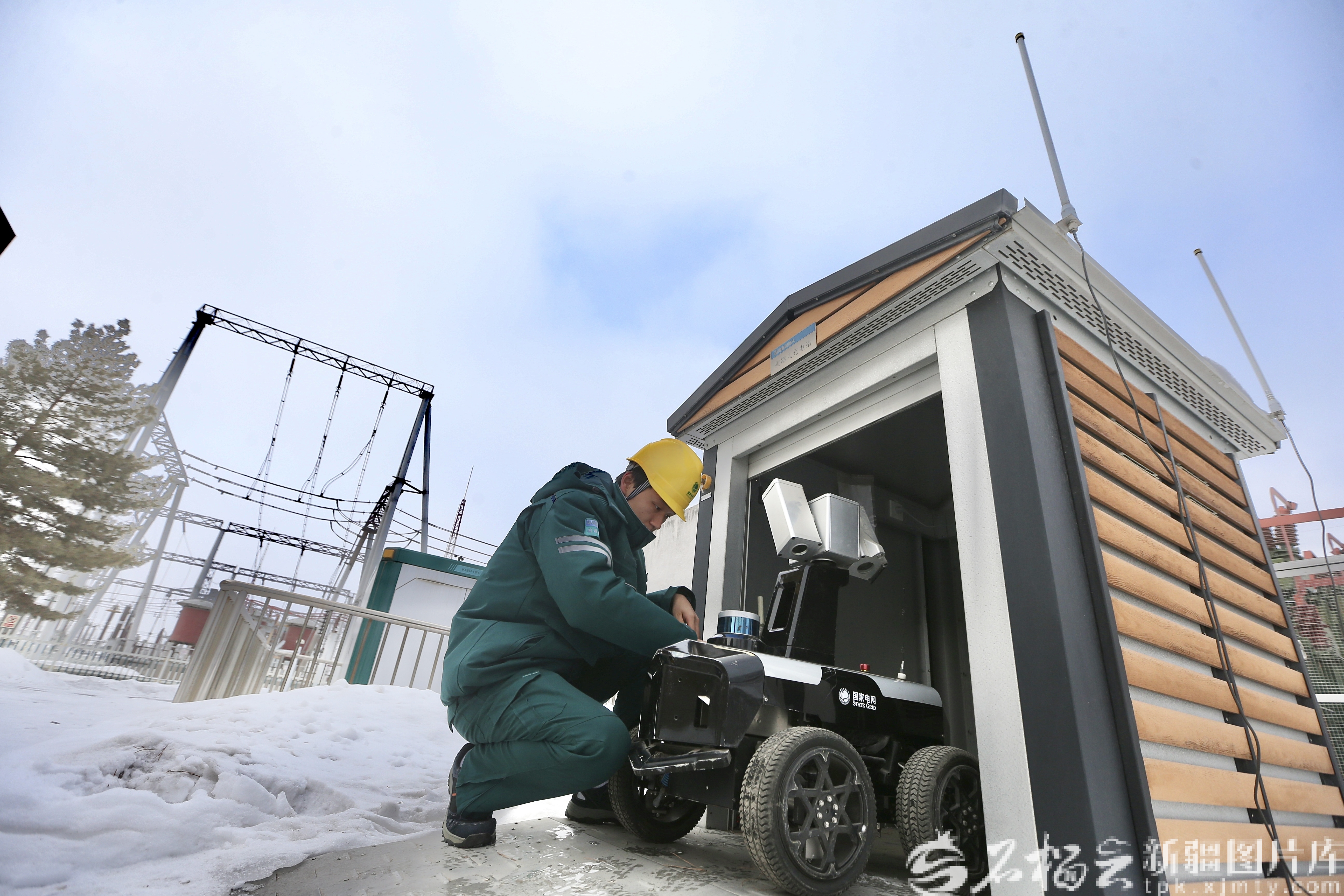 1月14日,在乌鲁木齐220千伏老满城变电站内,国网乌鲁木齐供电公司运维人员在为智能机器人充电。