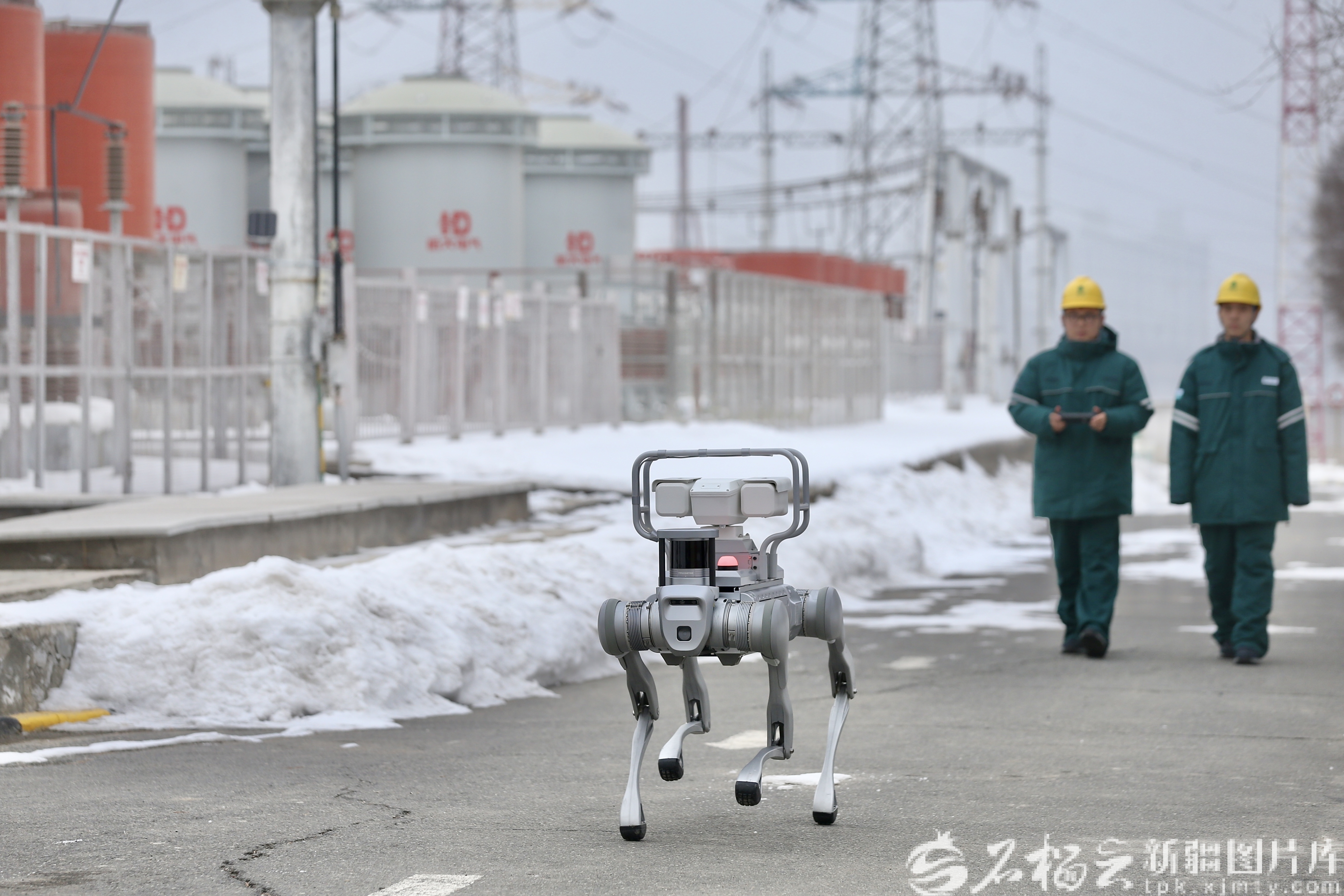 1月14日,在乌鲁木齐220千伏老满城变电站内,国网乌鲁木齐供电公司运维人员和一台智能机器人在对变电设备进行巡检。