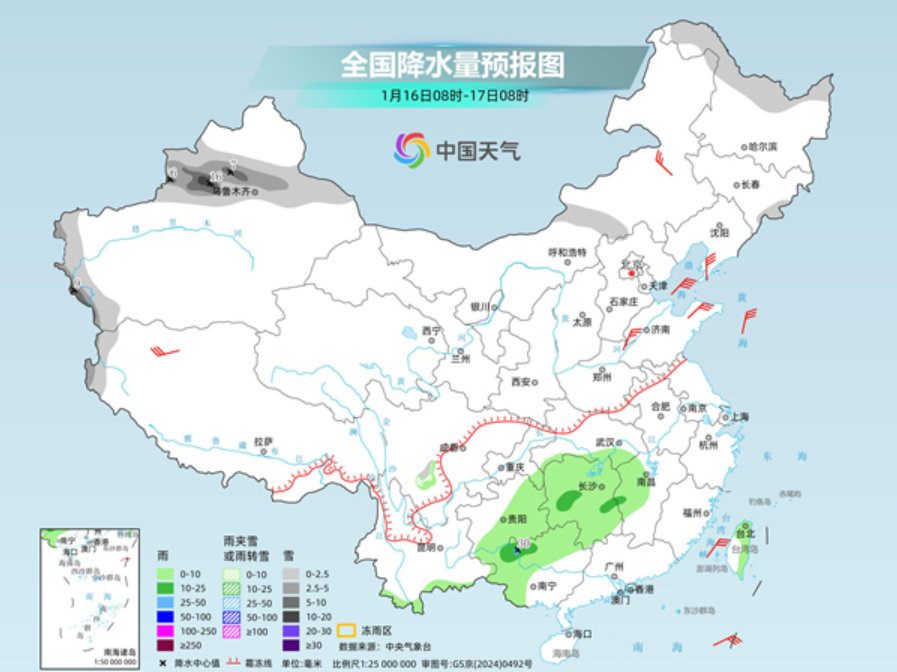 1月16日8时—17日8时全国降水量预报图。图片来源/中国天气网