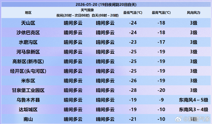 今明两天,北疆西部、天山北坡、哈密北部山区气温持续偏低。19日至20日,塔城北部、阿勒泰西部、乌鲁木齐南郊、昌吉东部等地有5级左右偏东风,风口风力更强,局地可能出现风吹雪。