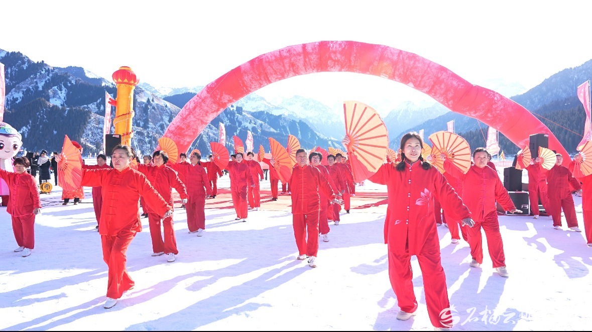 2026年天山天池景区冰封雪湖暨冰上项目启动现场的太极扇表演。陶蓝摄