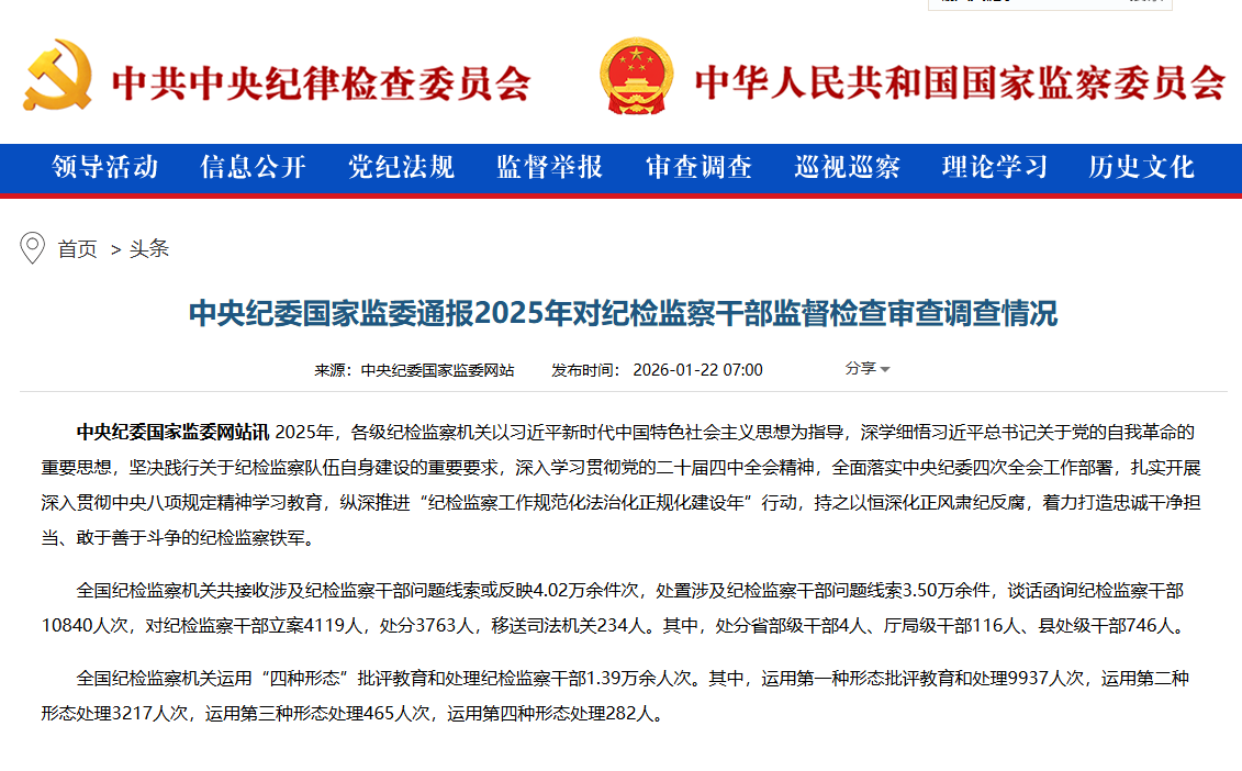 中央纪委国家监委通报2025年对纪检监察干部监督检查审查调查情况
