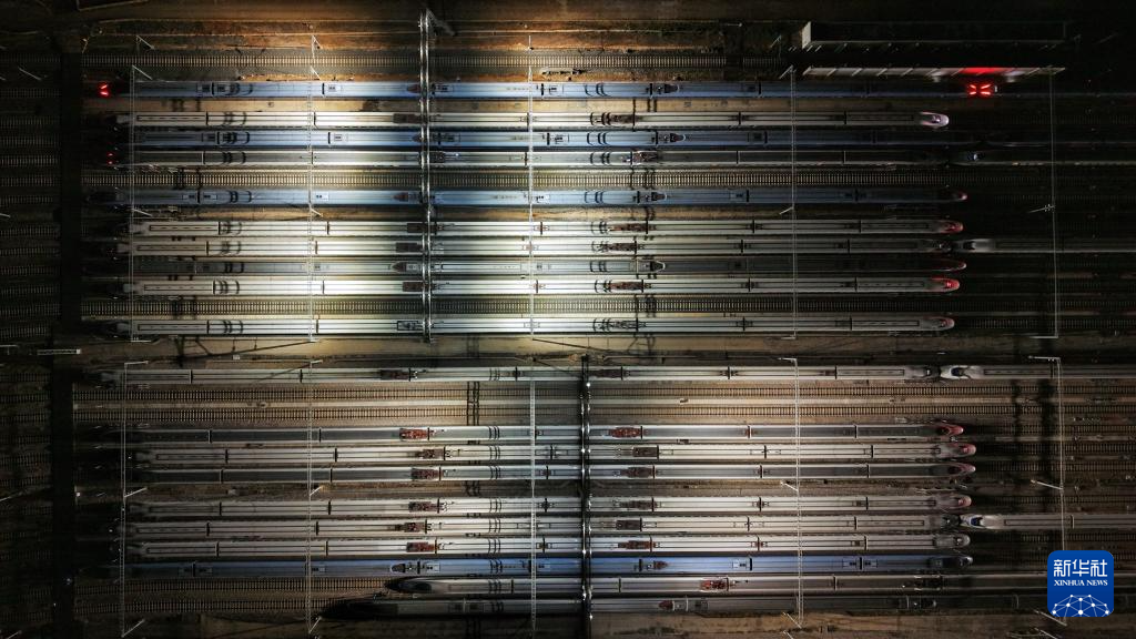 这是1月25日凌晨在昆明车辆段昆明南动车运用所拍摄的动车组列车(无人机照片)。新华社发(杨紫轩摄)