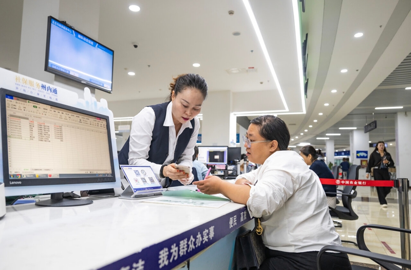 昌吉市政务服务中心大厅里,市民在工作人员指导下办理社保业务(2025年9月10日摄)。何龙摄
