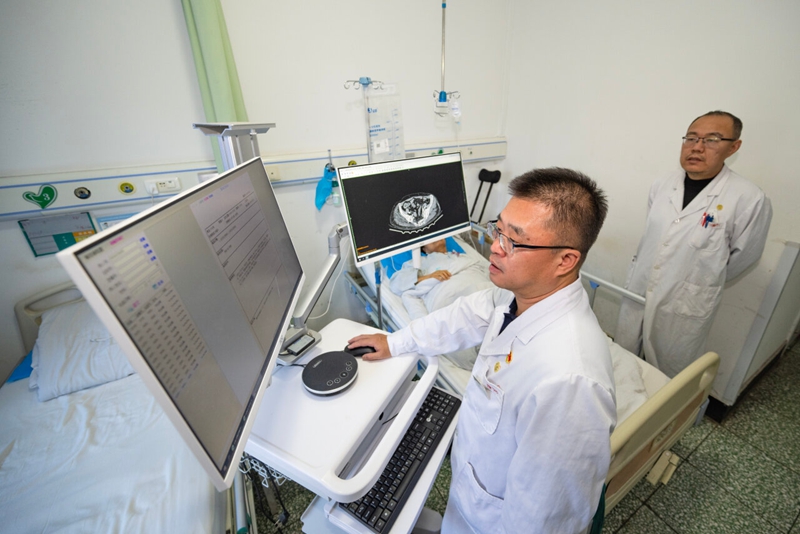 昌吉回族自治州人民医院医生通过5G远程会诊设备,在病房对患者进行多方会诊(2025年12月23日摄)。何龙摄