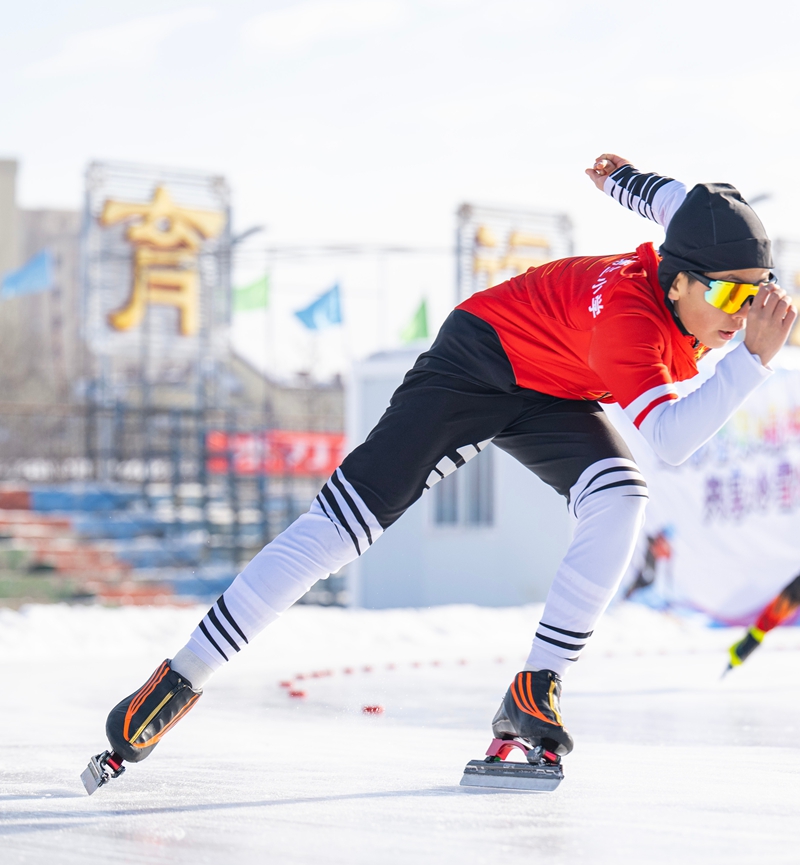 奇台县第五中学冰场,速滑小将在比赛中奋力滑行(1月12日摄)。何龙摄