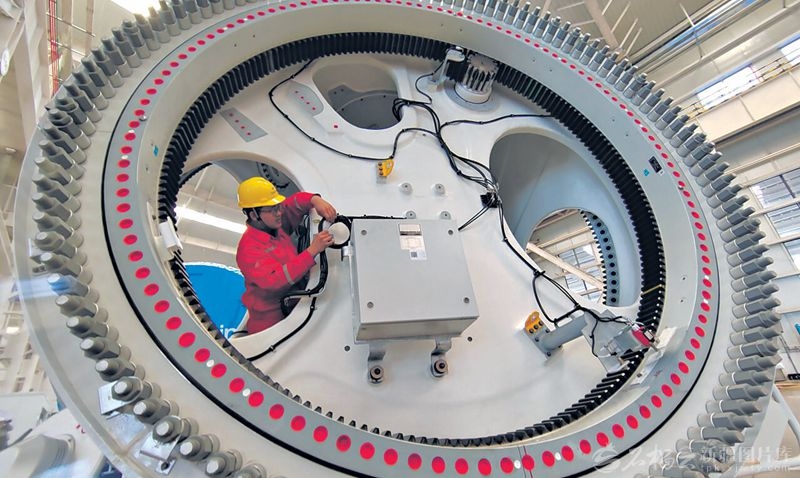 工作人员在塔城市金风风电设备有限公司组装车间查验风力发电机叶轮。资料图
