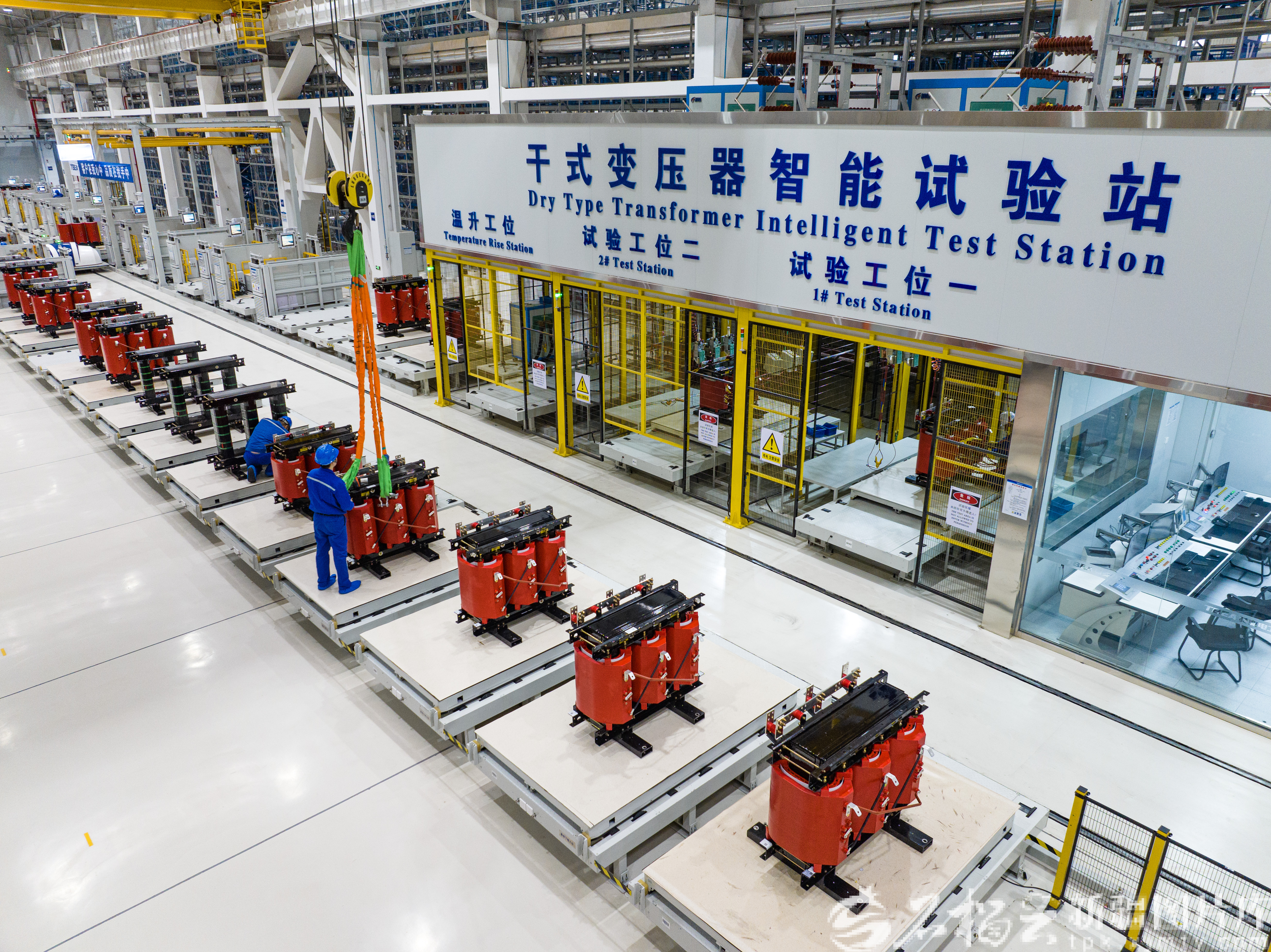 2025年5月11日,位于昌吉市的特变电工智能电气有限责任公司数字化干式变压器生产车间,工作人员在生产线上作业。何龙摄