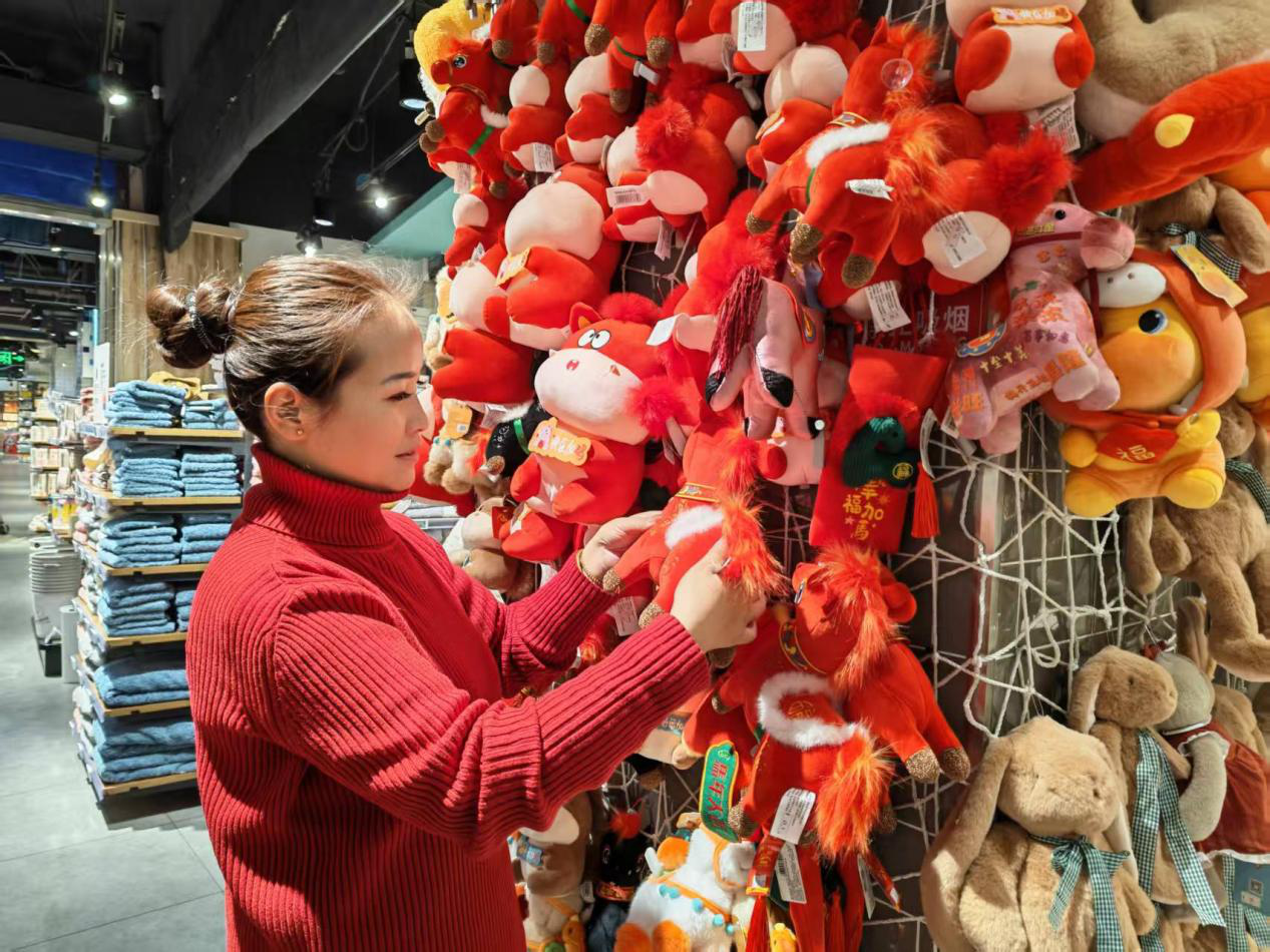 市民正在欣赏超市销售的马年吉祥物挂件。袁琪浩 摄