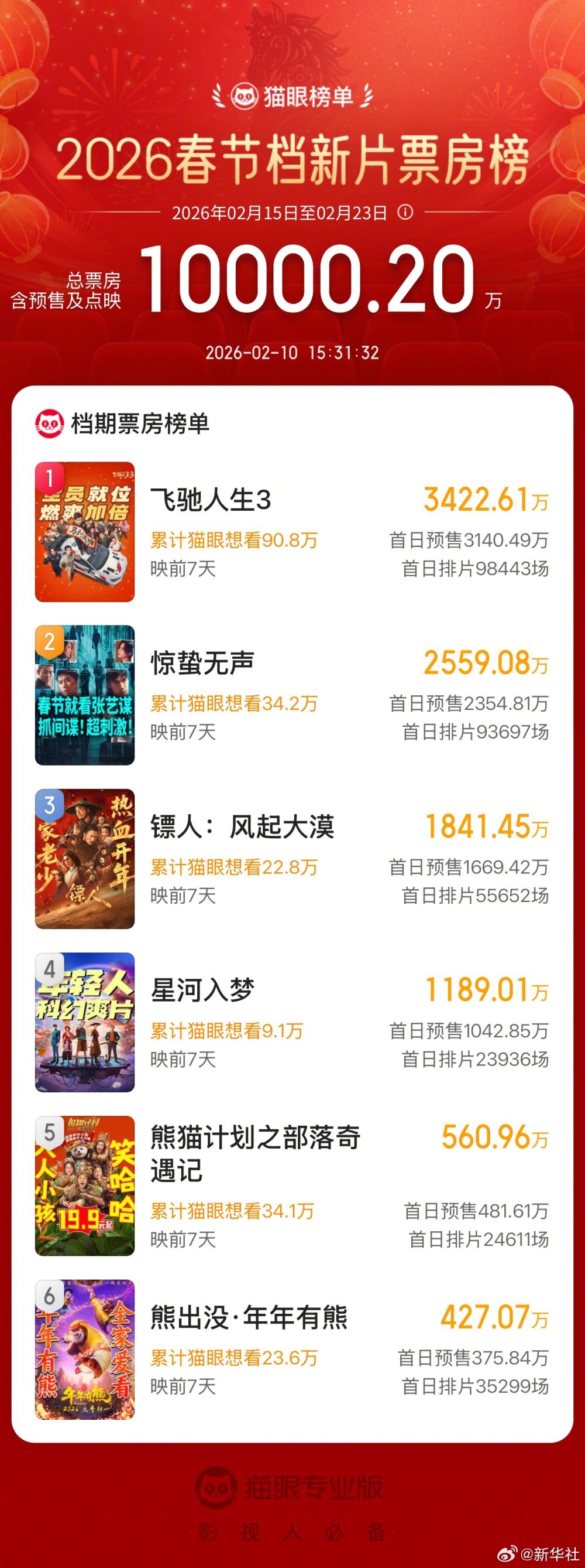 A+ A. A-据平台数据显示,2026年春节档新片预售总票房破亿,《飞驰人生3》《惊蛰无声》《镖人:风起大漠》分列2026年春节档新片预售票房榜前三。