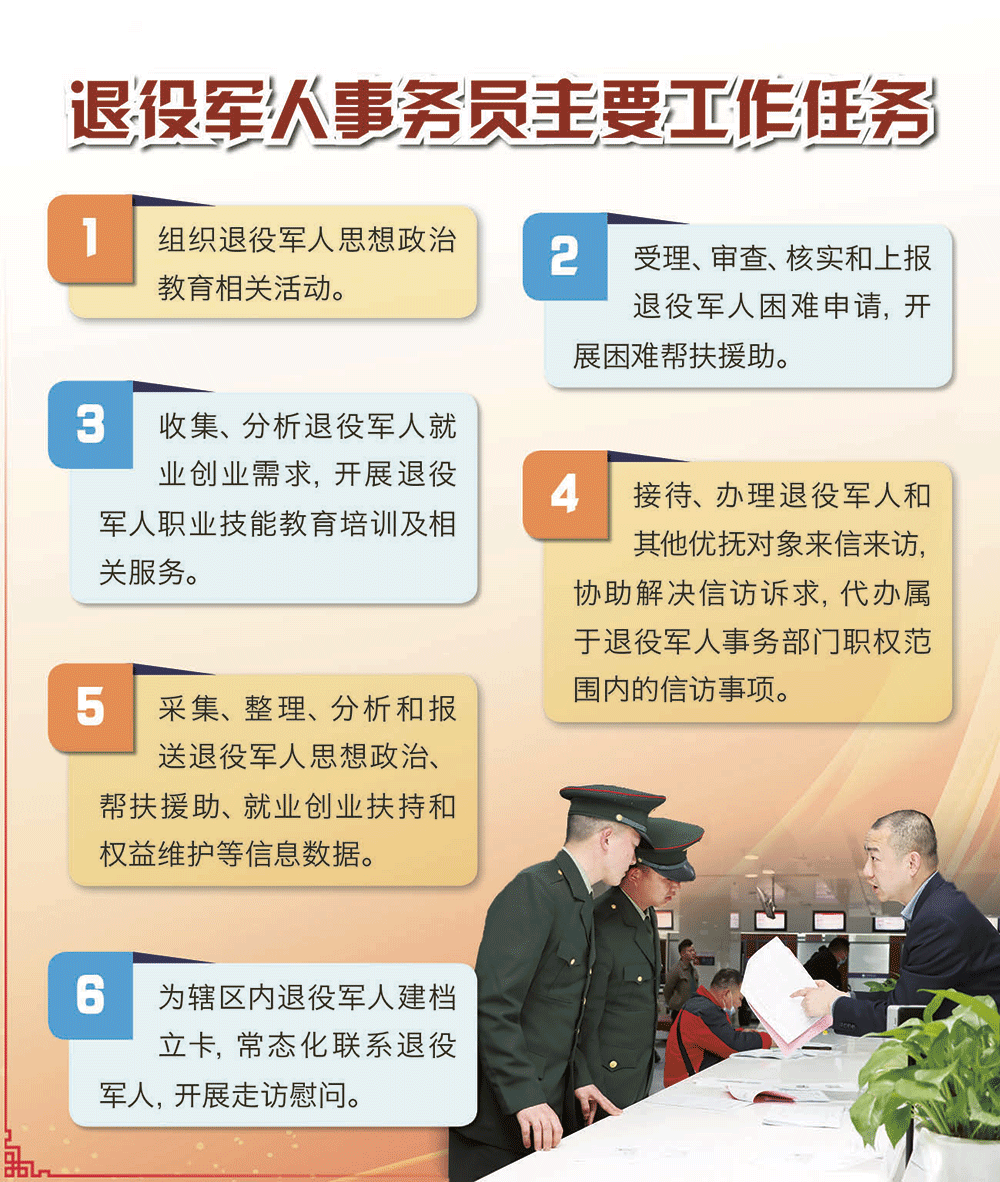 退役军人事务员,是指在退役军人服务中心(站)从事退役军人政策咨询、安置服务、就业创业扶持、信访接待、权益保障等事务办理工作的人员。2022年7月,退役军人事务员正式纳入国家职业分类体系,是首个由退役军人事务部归口管理、专门为退役军人提供服务保障的职业。2024年,退役军人事务部、人力资源和社会保障部联合印发《关于加快推进退役军人事务员职业技能等级认定的实施意见》,对做好退役军人事务员职业技能等级认定工作作出安排、提出要求,并公布了《退役军人事务员职业技能等级认定实施细则(暂行)》。如今,退役军人事务员职业技能等级证书的正式颁发,让广大退役军人事务员有了“职业身份证”,退役军人事务员这一新职业迈向专业化、标准化发展轨道。