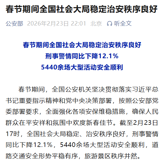 春节期间,全国公安机关坚决贯彻落实习近平总书记重要指示精神和党中央决策部署,按照公安部党委部署要求,全面强化各项安保维稳措施,确保人民群众在平安祥和氛围中欢度新春佳节。截至2月23日17时,全国社会大局稳定、治安秩序良好,刑事警情同比下降12.1%,5440余场大型活动安全顺利,道路交通安全形势平稳有序,旅游景区秩序井然。