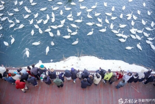 午后,几缕微光轻轻拨开云层,雾气稍散,冰面上那匹“骏马”依然朦胧可见。栏杆边眺望的身影、小吃摊前热闹的人群,却丝毫未减——仿佛无论天气如何,这里的年味与热情,始终温暖如初。