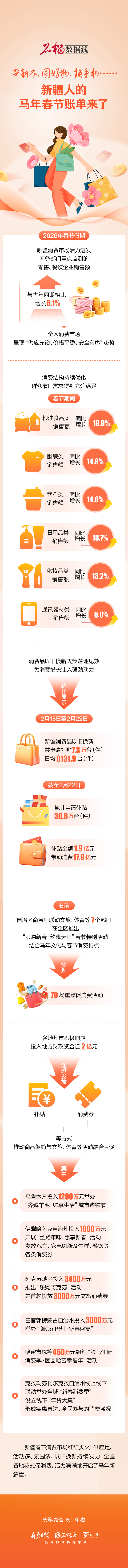 2026年春节假期,新疆消费市场活力迸发,商务部门重点监测的零售、餐饮企业销售额与去年同期相比增长6.1%,全区消费市场呈现“供应充裕、价格平稳、安全有序”态势。