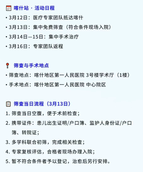 3月3日,喀什地区第一人民医院也公示了嫣然天使基金医疗专家团队喀什站活动日程:3月13日进行集中免费筛查,3月14日至15日集中手术。
