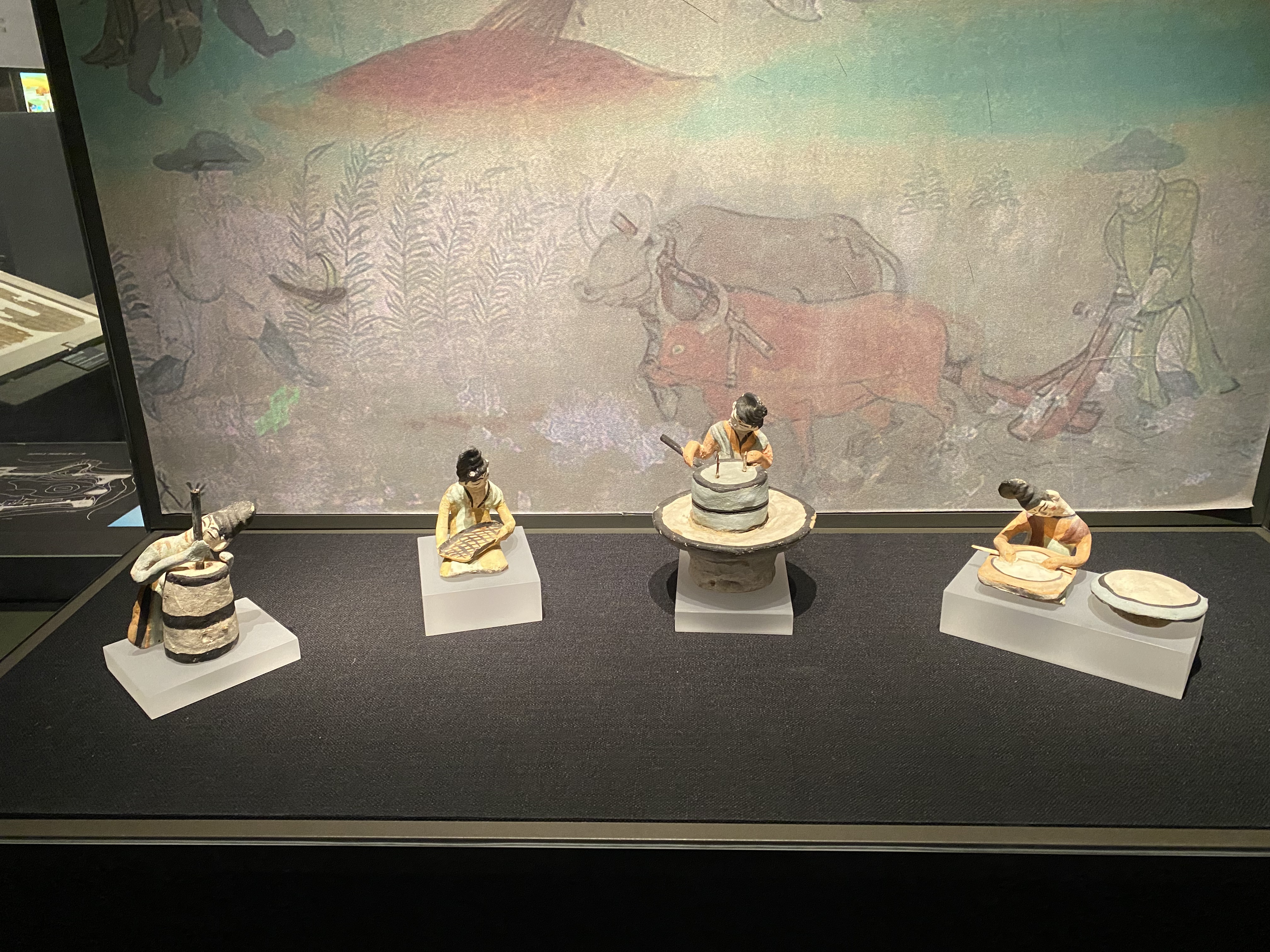 另一组彩绘劳动妇女俑,则生动再现了唐代劳动妇女的现实生活场景。这组木俑共有4尊,其中,舂米女俑正双手持杵,正用力捣米;簸粮女俑手端簸箕,仔细筛选着粮食;推磨女俑手持磨杆,转动磨盘研磨谷物;烙饼女俑双手持杖,专注擀着面饼,旁边还摞着几张已经烙好的饼。