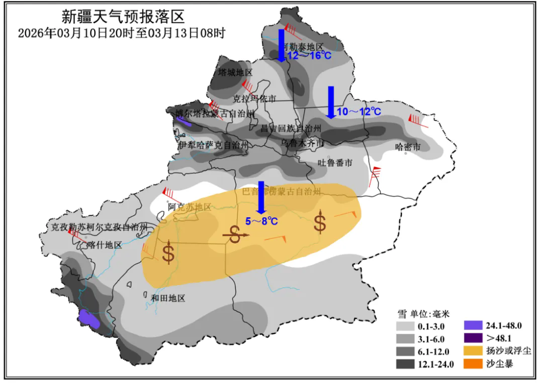 3月10日16时03分,新疆气象台发布寒潮黄色预警信号:预计今天夜间至13日夜间,全疆大部最低气温下降8~10℃,其中北疆大部、东疆下降10~12℃,阿勒泰地区下降12~16℃,将出现寒潮或强寒潮,请加强防范。