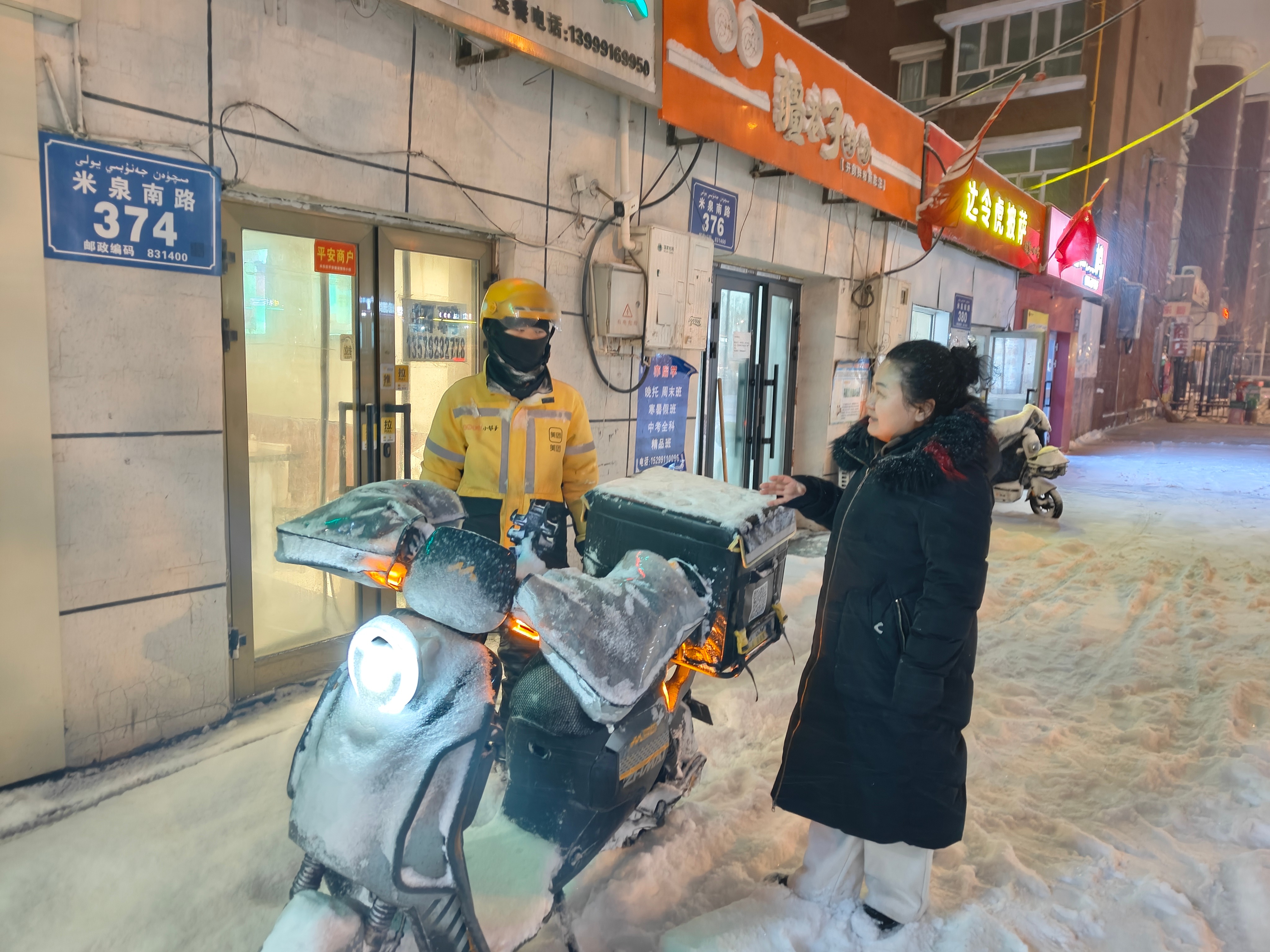 乌鲁木齐市米东区古牧地东路街道南苑社区工作人员邀请外卖员到社区服务站取暖,并主动帮忙清理餐箱和后视镜积雪。