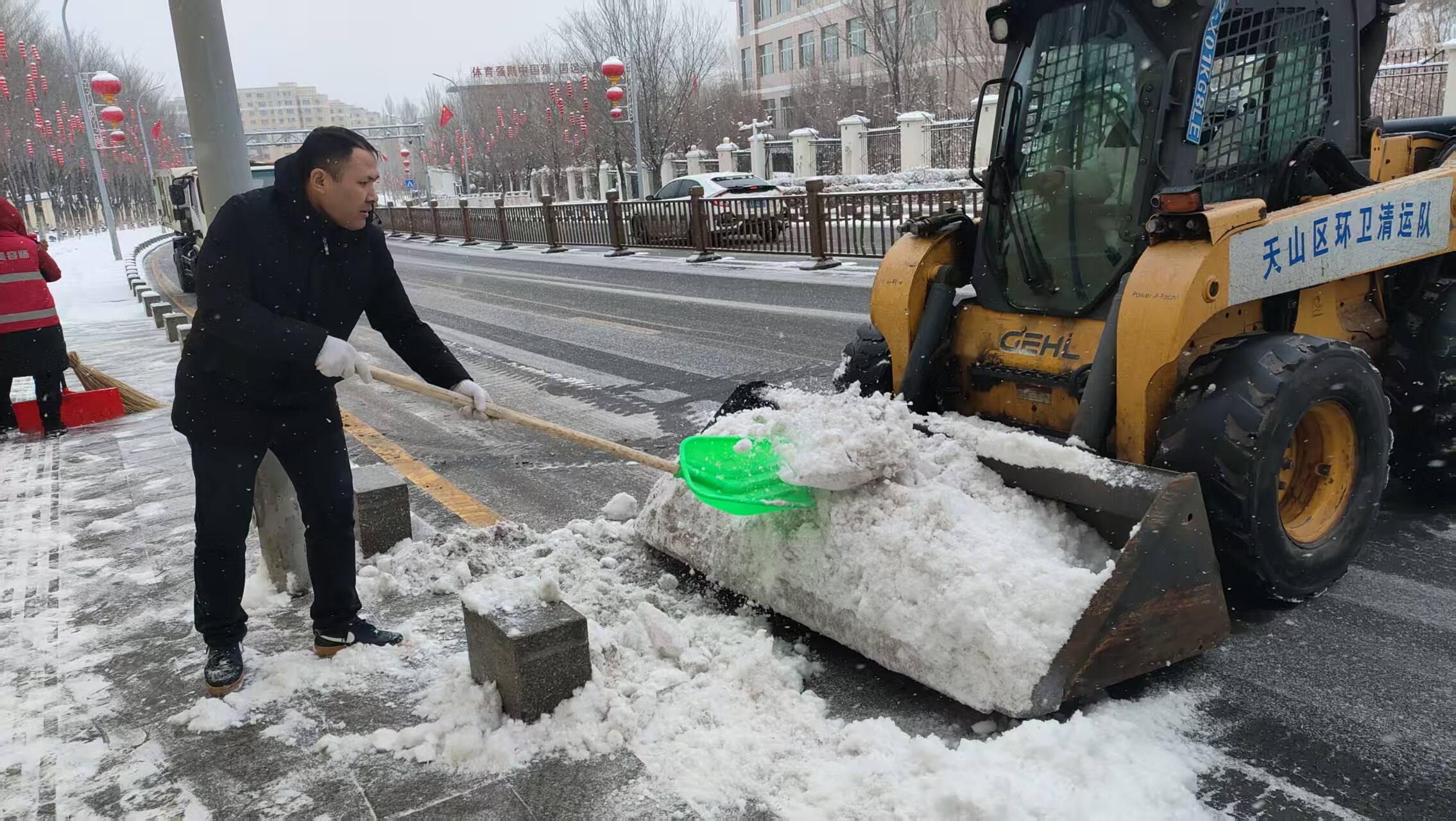 乌鲁木齐市沙依巴克区雅玛里克山街道铁西社区联合园林管理局驻社区工作队,组织工作人员与清雪作业人员奔赴辖区沿街人行路段,开展集中清雪行动。