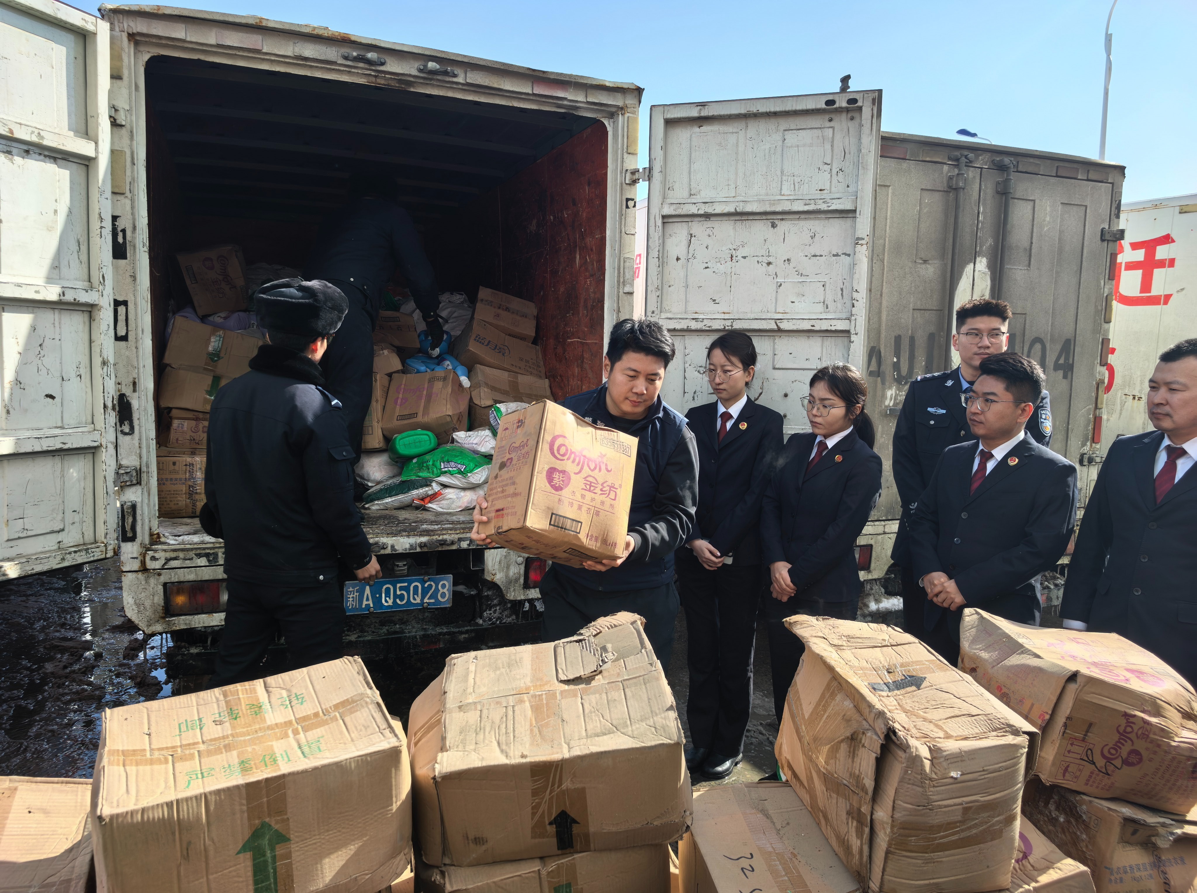 销毁现场,市场监管部门工作人员搬运待销毁的物品。石榴云/新疆法治报记者 龚彦晨摄
