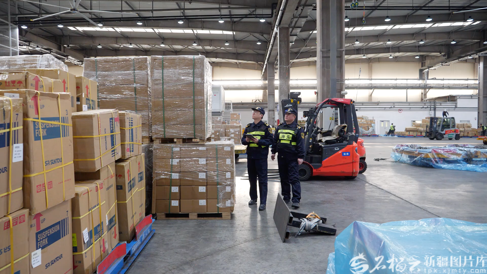3月30日,乌鲁木齐天山机场海关关员在机场国际货库监管即将出境的货物。刘飞虎摄