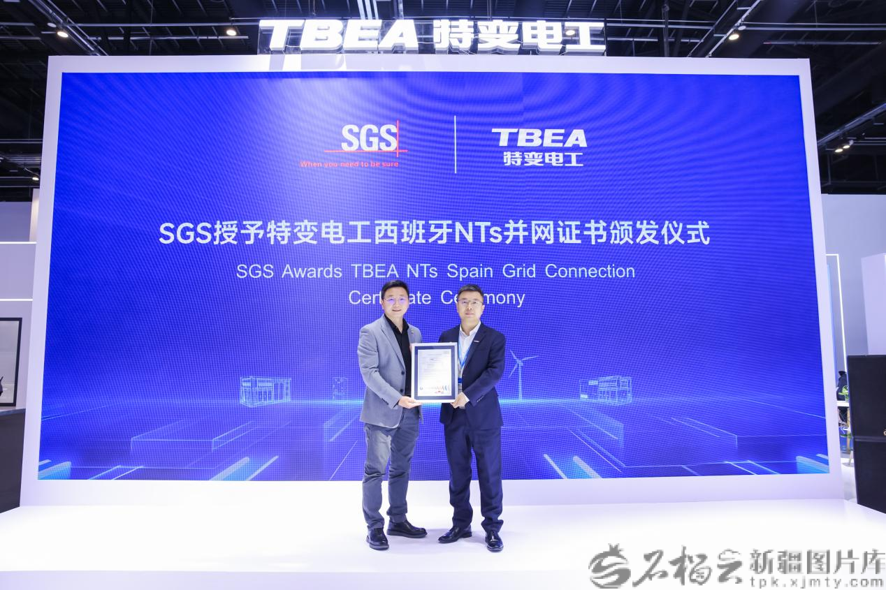 特变电工西安电气科技有限公司自主研发的TE215K-HV组串式储能变流器,连续获得欧洲两项权威认证。图为西班牙NTS并网证书颁发仪式现场。受访单位供图