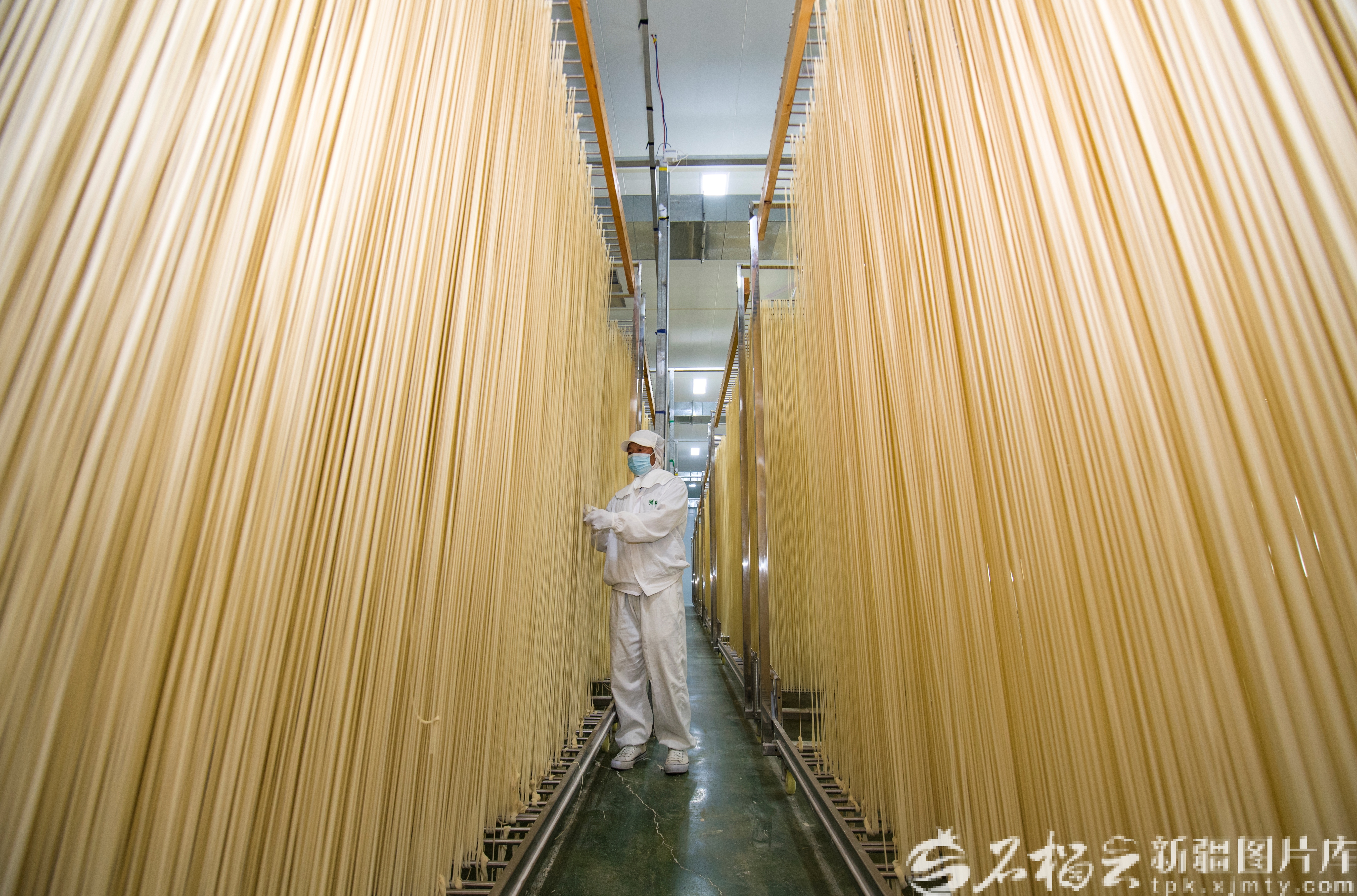 奇台县半截沟镇腰站子村农业产业园有机手工拉面生产车间,工人在加工有机手工拉面。何龙摄