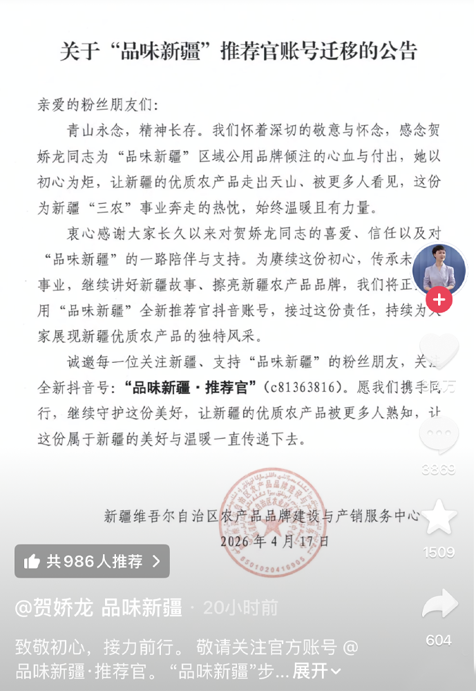 新疆维吾尔自治区农产品品牌建设与产销服务中心发布《关于“品味新疆”推荐官账号迁移的公告》,对贺娇龙账号及新开通账号的情况予以说明。